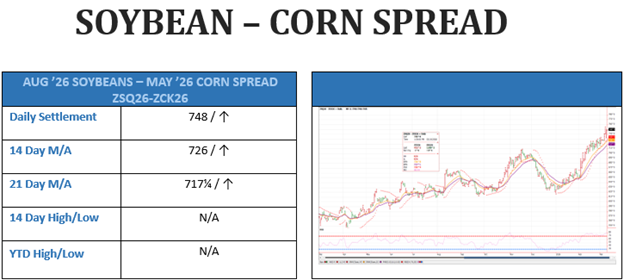 ZSQ26-ZCK26 (AUG ’26 SOYBEAN – MAY ’26 CORN SPREAD) has been climbing from a price of about 660 in early February to its current 52-week high settlement of 748. It has been hovering above the 14-day and 21-day moving averages this entire time. I think we should be looking to get short, but not until it trades below and settles below these moving averages. When it does, I think it might be a good place to get short this spread with a stop to exit the trade just above the 52-week high.