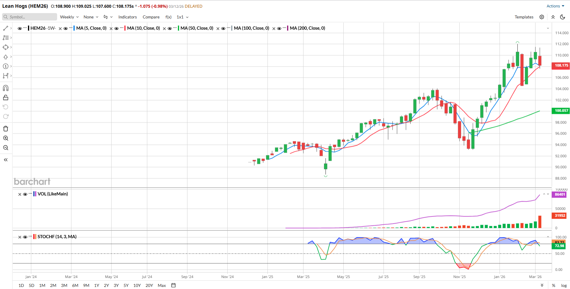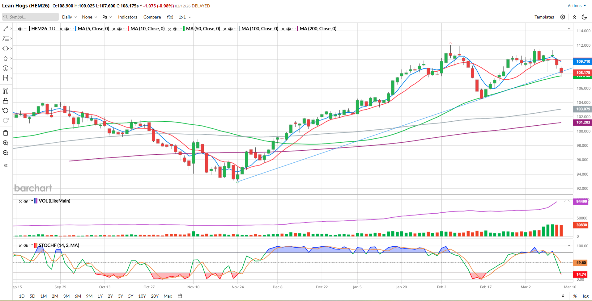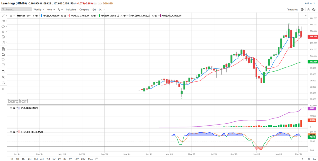 You can view Barchart’s Seasonal Data here. According to their data, over the past 15 years, June Hogs tend to go lower during March in 58% of those years and it’s a 50/50 proposition in April.