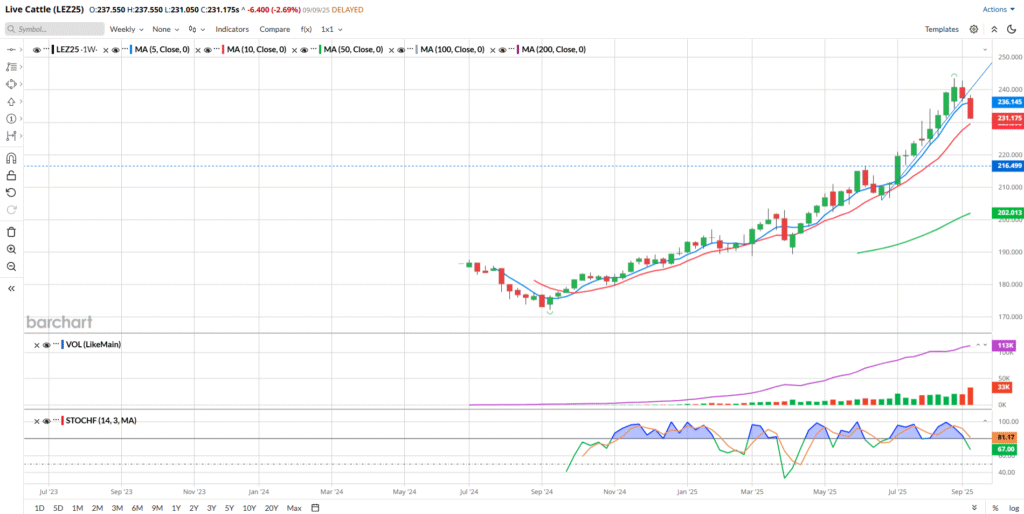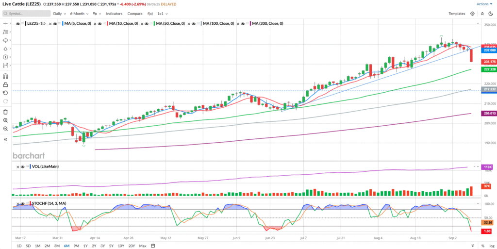 Seasonal Data can be found here, if you’re interested.  Given the supply/demand equation here in the Cattle markets, I’m not certain that the seasonal patterns or tendencies matter very much right now.   The data table does show that, on average, Live Cattle prices tend to decline in the month of September.  Not by much, usually, as Barchart has pegged the average decline at only -0.112.  There have been some large moves down in past years. 2021, 2016 and 2015 show the most recent declines, but according to Barchart’s data, most of the time (10 out of 15 years, not including 2025) they end the month higher.