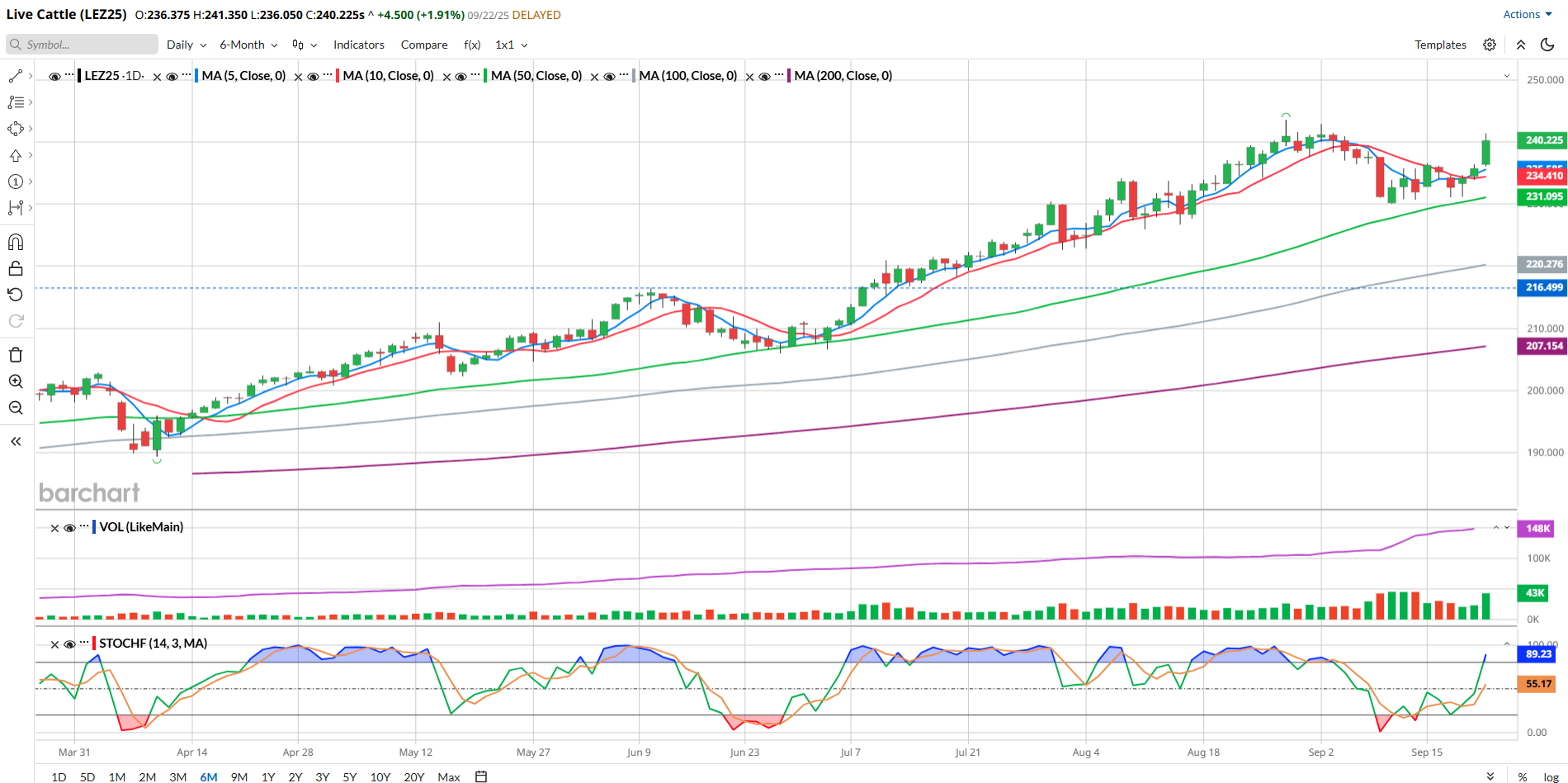 - From a technical point of view, I think the market looks strong. Following 5 days of negative price activity to start the month of September, prices then went sideways for 7-8 sessions, before breaking back to the upside today. Looking at the chart above, you may notice that the 5- and 10-day moving averages (blue and red) made a bullish crossover with Friday’s trade. The last bullish cross like that was on July 1st, and prices rallied for nearly 2 months following. I don’t think this turn higher will last that long, but we’ll have to stay tuned to find out. The 50-day average (green) acted as solid support in late June-early July, as did the 100-day average (grey) when it was tested in April. The 50-day is the closest at about 231.100, while the 100-day is near 220.275. The 200-day (purple) is near 207.000 and not currently in play to my thinking. Stochastics (bottom subgraph) are pointing higher, with the “fast” line getting into overbought territory. Looking back over this chart, it does appear to me that this market has been comfortable being overbought, spending more time that way, rather than oversold. Volume today (mid graph) was strong, above 42,000 contracts, nearly matching the high levels seen a couple of weeks ago. In my experience, high volume on a directional move like this usually will result in more price strength, barring a technical reversal or other outside influence.