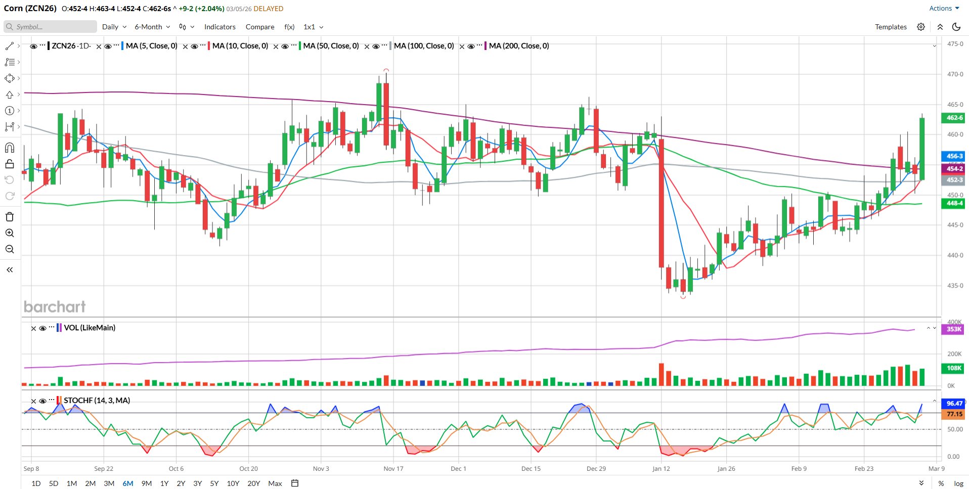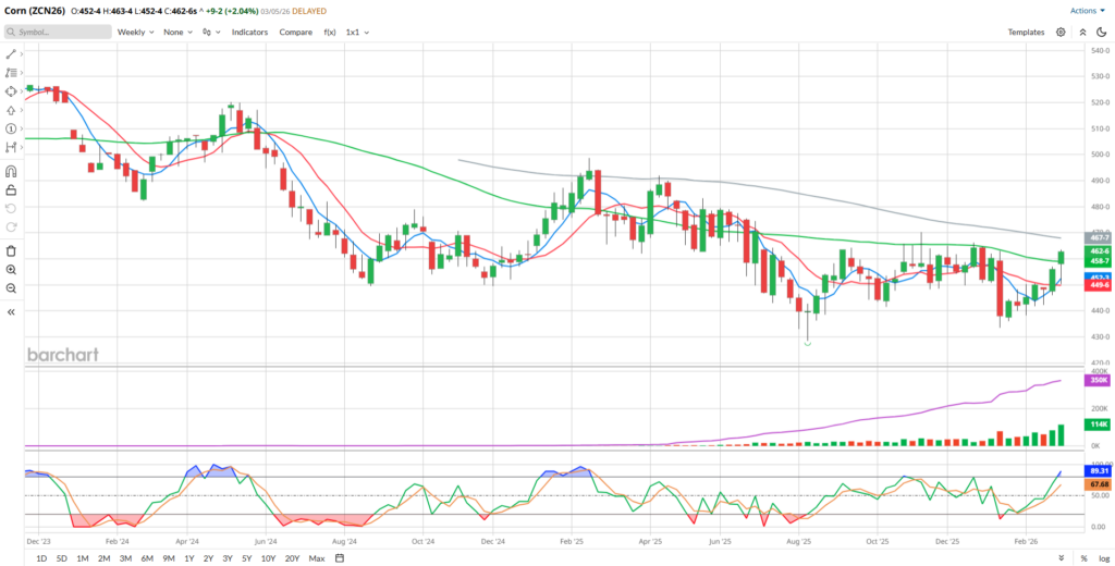 Today, July Corn gained 9 ¼ cents, to close at 4.62 ¾. I think that today’s activity was significant for several reasons. The close was the highest since the day after Christmas. You might notice by looking at the chart that today’s trade engulfed not only Wednesday’s bar, but Monday and Tuesday’s, as well. You may also see the 200-day moving average (purple, 4.54 ¼) and see that the market settled some 8 ½ cents above that, the largest differential that’s visible on this view and the highest above that long=term average since May of 2025. And we’ve finally seen July Corn erase all of the bearish price activity that arrived in January with the USDA crop estimate. Basically, nearly all of the technical indicators that I watch are all bullish right now.
