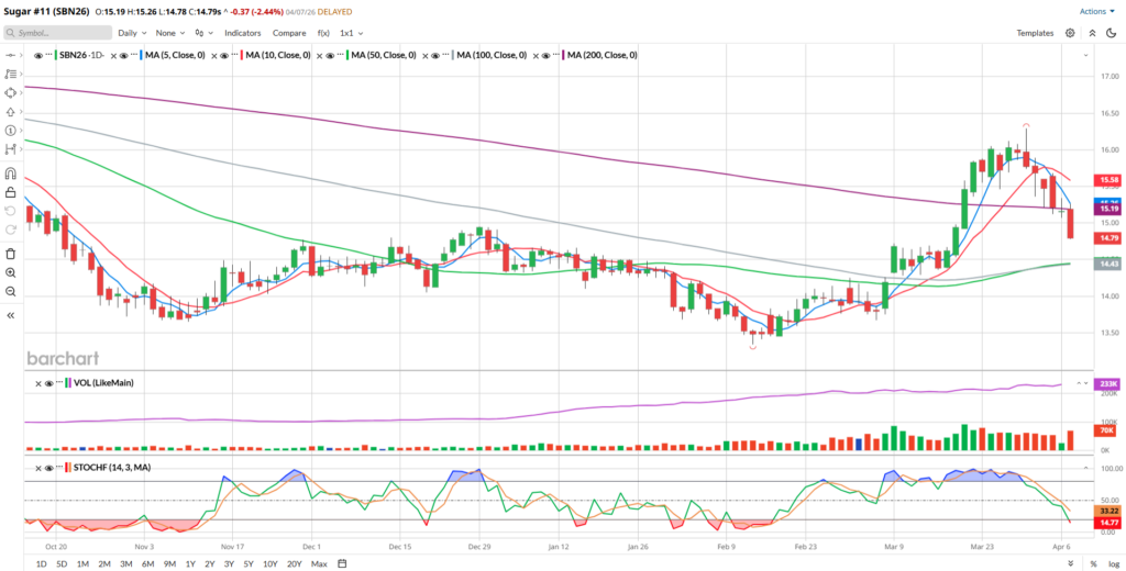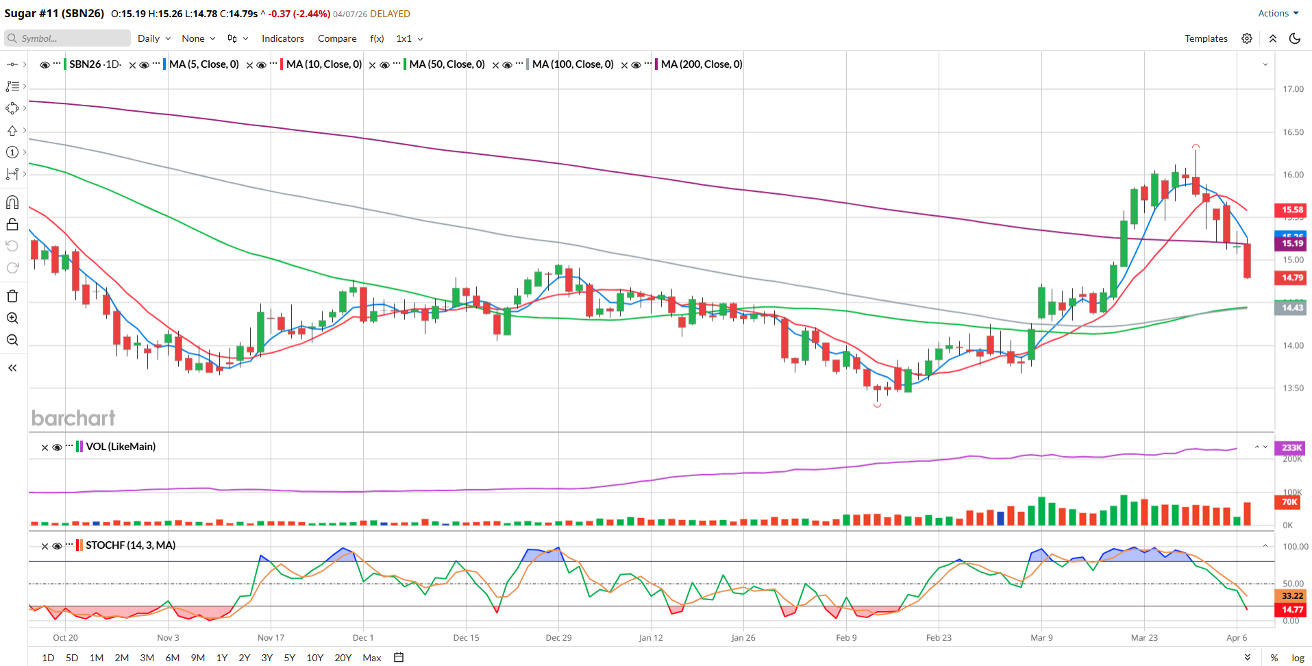 Looking the chart above, I’d like to point out a few things that stick out to me. First off, Sugar prices had been relatively stagnant, with a mild bearish trend from Oct-Feb. The February low of 13.34 sparked a rally for about a month and a half, up to the recent high posted at 16.29 last Monday. That spike high is not usually a bullish sign, in my opinion, as the market closed at/near the lows of the session. Prices then declined to the 200-day moving average (purple) by the end of the week, settling just a tick above that average, usually a measure of long-term trend. Today, that average is at 15.19, offering potential resistance. The 5- and 10-day moving averages (blue/red) made a bearish crossover with Thursday’s trade and are both above the market, also offering potential resistance, at 15.26 and 15.58, respectively. The 50- and 100-day averages (green/grey) made a bullish crossover the day before, on April 1st, and are offering potential support below the market at 14.45 and 14.43, respectively. Stochastics, bottom sub-graph, are declining and are just barely starting to tick into an oversold condition. Looking back over this time frame, Sugar futures seem to have preferred being oversold rather than overbought. There may be a shelf of support around the Nov-Dec highs, but today’s settlement broke below the Dec high of 14.95 and is just a tick above the Nov high of 14.77. Today’s trading volume, just shy of 70,000 contracts, is the highest this market has seen since March 23rd. High volume on a big directional move is usually a sign of more to come, in my opinion.