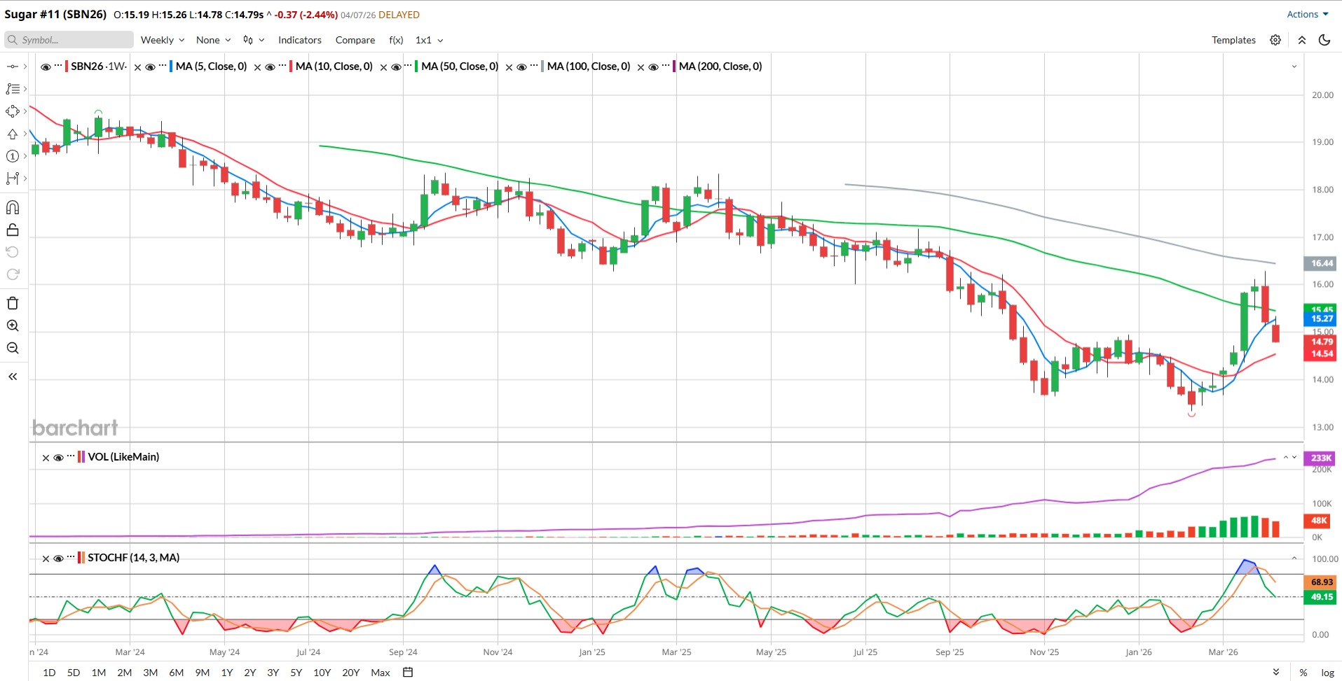 So far for the week, July Sugar is down 0.42 from last week. Yes, I know it’s only Tuesday and there are still 3 days left in the trading week. Last week’s bar posted a bearish engulfment and prices came back below the 50-week moving average (green, 15.45 today) after managing 2 weekly closes above it. The 100-week is grey, at 16.44 today, and has not been tested over the life of this contract. The 5- and 10- week averages made a bullish crossover during the middle of March (the most recent large green bar) but prices have come back below the 5-week (blue,15.27) and appear to be headed toward the 10-week average (red, 14.54) To my eye, this appears to be a similar set-up that we saw in Sugar trade last spring. If you look back, you may notice a bullish cross by the 5- and 10-week averages in February 2025, prices closed above the 50-week average for 6 of the 9 weeks in 2025, before resuming/accelerating a downtrend until November. We’ll have to wait and see if this holds true for 2026.