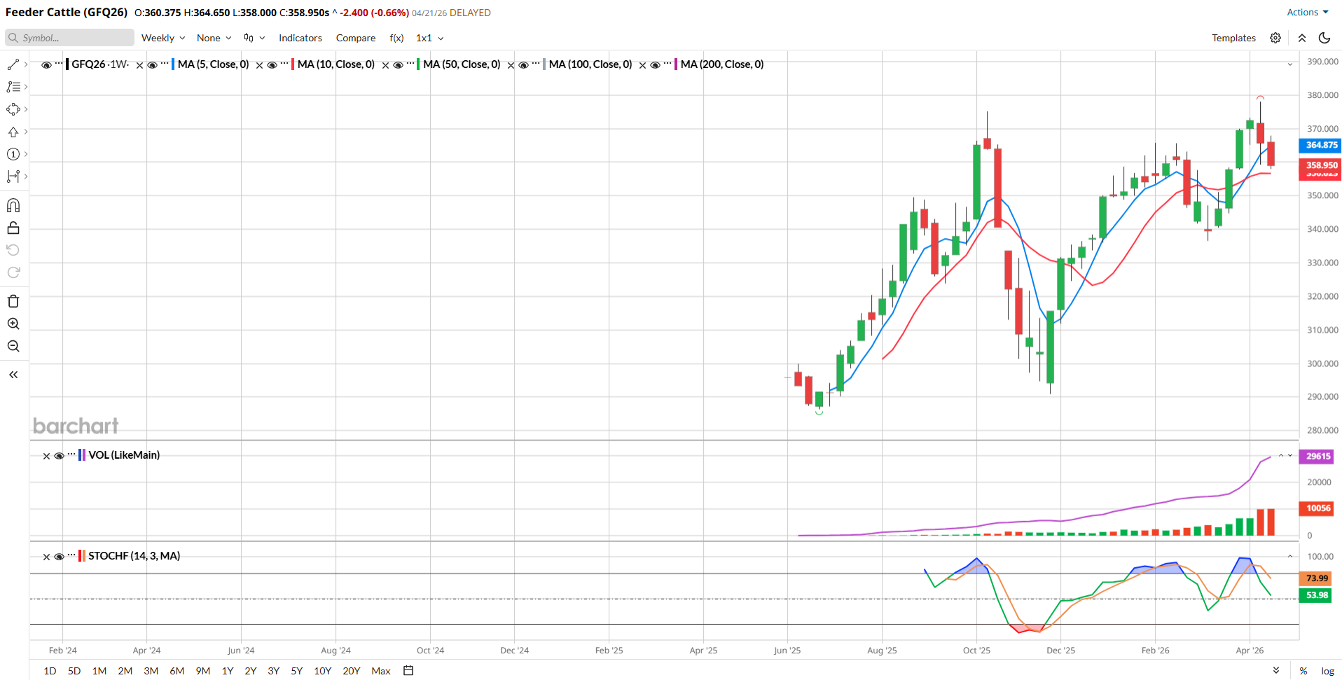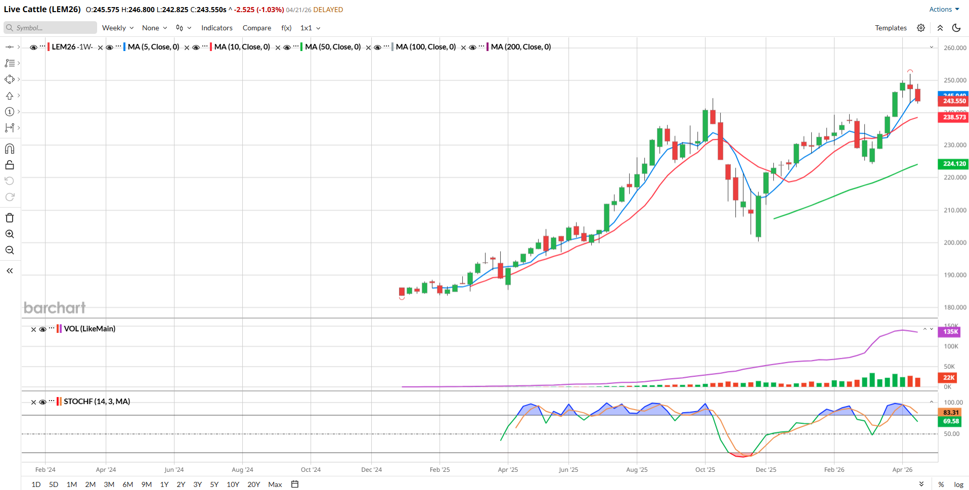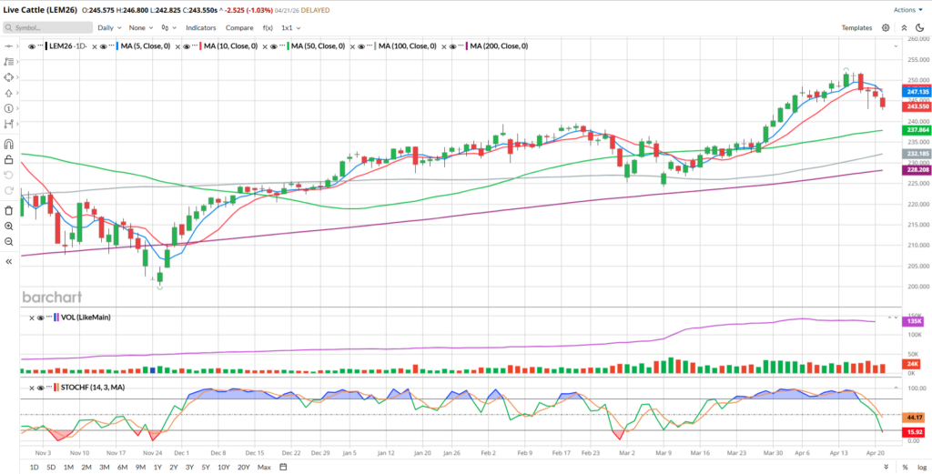 Today, June Live Cattle closed down 2.525 to settle at 243.55 and August Feeders (now the front month according to volume and open interest) dropped 2.40 to settle at 358.950.