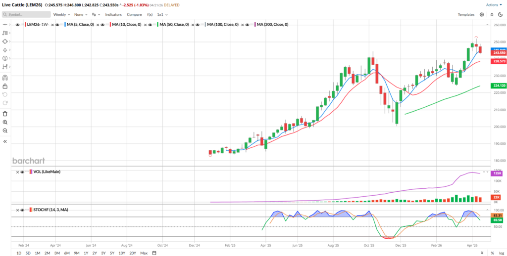 By looking at the chart above, you may notice a few things. Today, the 5- and 10-day moving averages (blue/red) made a bearish crossover in Live Cattle. August Feeders (not pictured) made that bearish crossover yesterday. On the chart above, those averages are offering potential resistance at 247.135 and 247.795, respectively. The 50-day (green), 100-day (grey) and 200-day (purple) are all still in a bullish configuration and inclined higher. The 50-day is the closest potential support level at 237.864. Stochastics (bottom sub-graph) are just starting to tick into oversold territory and are pointing lower.