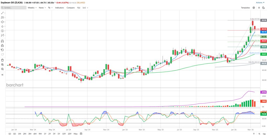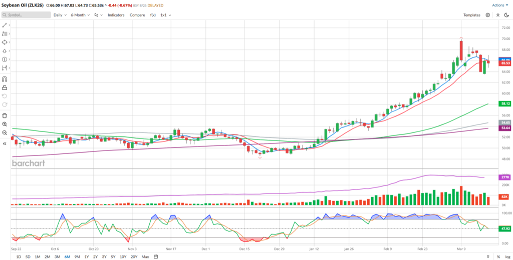 The recent trend higher has been spurred (recently) by the war with Iran. Before that happened, the market was already trending higher as traders are anticipating a new biofuel mandate from the US Gov’t. That mandate has been delayed several times and I believe that it was leaked last week by a major newswire. That might explain the limit down move on Monday in Bean Oil and nearby (old crop) Soybeans. Allegedly. The “official” announcement may come at the end of next week on the 27th, at a White House event. I think this may be a “buy the rumor, sell the fact” type of setup. Price volatility has certainly jumped higher over the past few weeks, as evidenced by the larger price swings happening with greater frequency than previously.