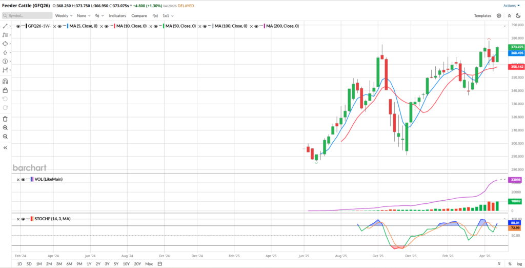 Feeders (August is front month now) haven’t quite rebounded to new highs, but they do appear to be headed in that direction.  August’s settlement of 373.075, up 4.800 today, leaves another 4.975 higher before we see new contract highs there.   They certainly appear to be headed in that direction, to my eye, at least.