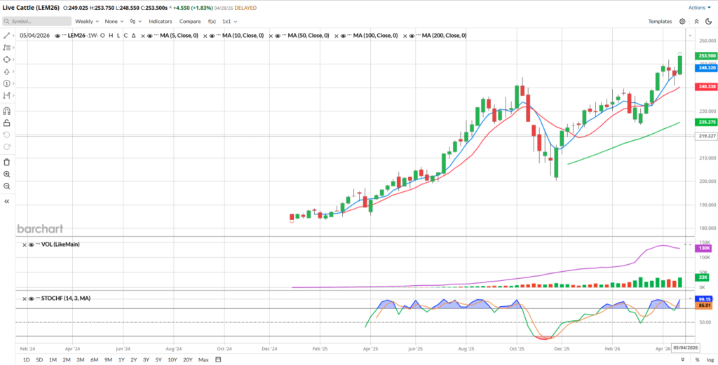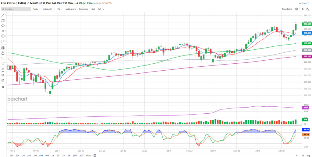 Today, June Live Cattle closed at a new contract high settlement, 253.500, gaining 4.550 on the day.  Following a brief technical correction that started mid-month, Cattle prices have rebounded very strong.  We’ve seen the Cattle on Feed and Cold Storage reports go by on the last 2 Friday’s.  I don’t think either could be classified as bearish, as the herd (# of head) and what we have stored in the freezer (frozen beef) continued to decline.  Prices in the June Live Cattle retraced to the 62% Fibonacci level (not pictured, 241.511) drawn from the March low to the early-April high.  And now we’ve set new highs!