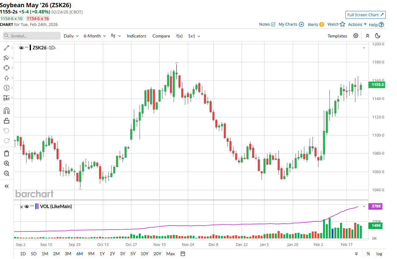 Recent concerns over the state of the Brazil soybean crop brought speculative money to the soy complex today, as did a firmer energy market. Grains tried to rally to start the session but struggled. An ongoing lack of flash sales and US trade uncertainty following recent developments with US tariffs limited trade in all contracts in my view. Much of the recent rally in the soybean market has been driven by large-scale speculative buying from managed money, the long position in the managed money category is thought to be long near 160K. This in my opinion is akin to what we saw this past October/November in response to the initial handshake trade deal between President Trump and Premier XI. The managed money long was above 220K Thanksgiving week. Look at the chart in December to mid-January in beans. The Same type of set up could be occurring moving forward, with the result that those longs may eventually get nervous if no confirmation of additional Chinese buying is seen, especially given the timing of an expected record Brazilian soy crop bringing notably cheaper beans to the market in March with Argentina’s harvest to follow.