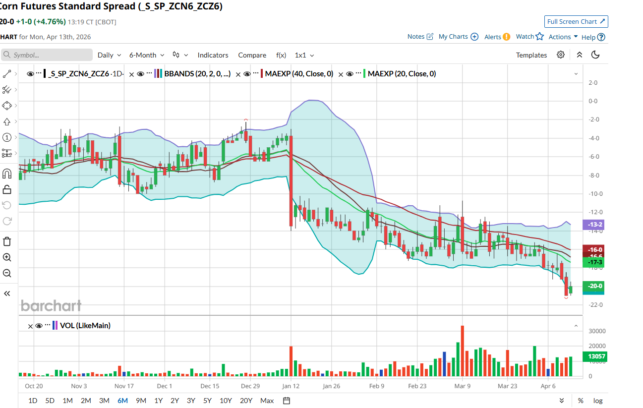 The Trump administration followed up with an announcement on Sunday that the US would selectively blockade the Strait of Hormuz itself. The US plans to halt economic and military traffic that supports Iran, while it “will not impede freedom of navigation for vessels transiting the Strait of Hormuz to and from non-Iranian ports.” In addition to screening vessels, the US Navy will proceed to clear any mines in the Strait and sink any aggressive ships. President Trump also declared that China would face an additional 50% tariffs if it is found to be trying to resupply Iran with weapons. Crude oil jumped nearly $9/barrel but moderated by the end of the session. The USDA inspected 70.2 million bushels of cornfor export shipment in the week ending 4/9, coming in toward the top-end of the estimated range as demand for U.S. corn exports remains red hot. Cumulative corn export inspections in the ‘25/’26 marketing year total 1.977 billion bushels, up 33.9% year-on-year and easily representing an all-time high for this point in the year, keeping us comfortably ahead of the seasonal pace needed to reach USDA’s record 3.300-billion-bushel export target. Despite the noise from the war and insatiable demand, rallies keep getting sold into for corn. Managed funds pushed out to a 300K contract long but have shredded maybe 30% of that length, with a net long approximately at 180K. Today was day 4 of the Goldman roll. We are looking to be a buyer here after the roll. Trade idea below.