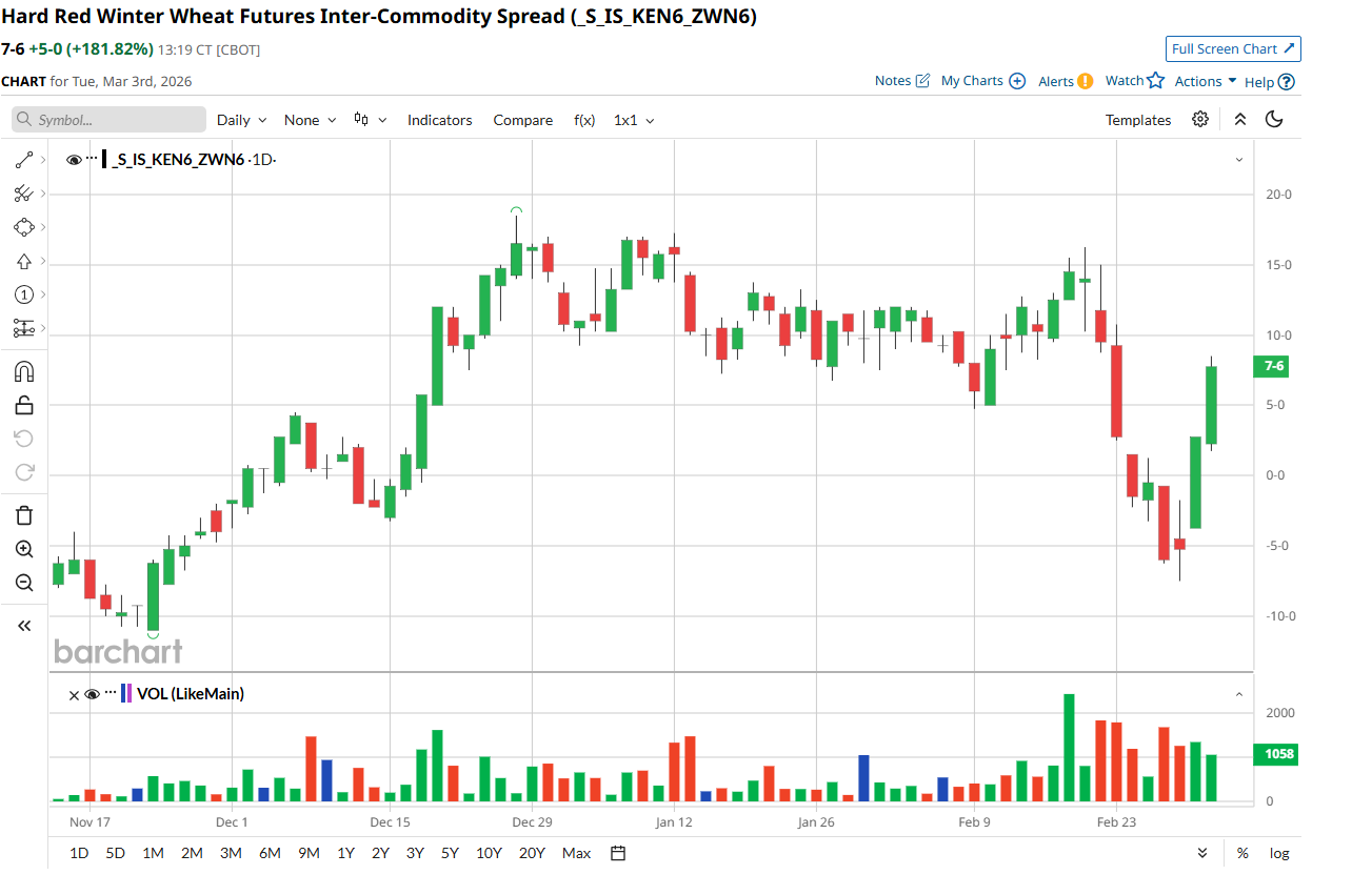 Wheat has garnered much attention and has seen a tremendous amount of short covering in the last two weeks as managed money has covered approximately 60 to 70k Chicago wheat shorts in that time. Geo-political headlines have driven funds to flip long KC wheat in my opinion. The war with Iran brings headline after headline with some valid and others merely clickbait or not the whole story. For example, the following headline may seem bullish, but after reading carefully would in my view lean bearish. Headline: Reuters news reported that Russian grain exports to Iran stalled after the U.S.-Israeli airstrikes last weekend. Wheat opened higher on the news Sunday night once announced. However, a deeper dive into the story would find that most of the grain has reported already been moved. Russian exporters have shipped 1.9 MMT of wheat this season out of a planned 2.0-2.2 MMT, with total grain exports from July-Feb already at “almost 6 MMT”, up from 3.0 MMT over the same span last season. Bull headline, bearish story in my view. Lots of confusion and misinformation. Domestically, state by State condition ratings showed a number of states posted declines, especially Colorado, which fell 18 points from the beginning of January. Oklahoma and Kansas felt lesser amounts with 4- and 3-point cuts, respectively. Texas has a very low G/E rating at 16%, but it’s 3% better than a month ago. The weather forecast remains steadfast in its beneficial moisture outlook through mid-March. The only areas expected to miss much of the rain are western KS and CO. Both are key producing states, but the season is far from unsalvageable. Wheat after all is a weed and can reemerge fast with beneficial weather albeit for a short time. KC seems to be a more attractive bet than Chicago due to potential weather concerns moving forward given where conditions stand now. Spread Chart below, July KC vs. July Chicago wheat