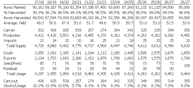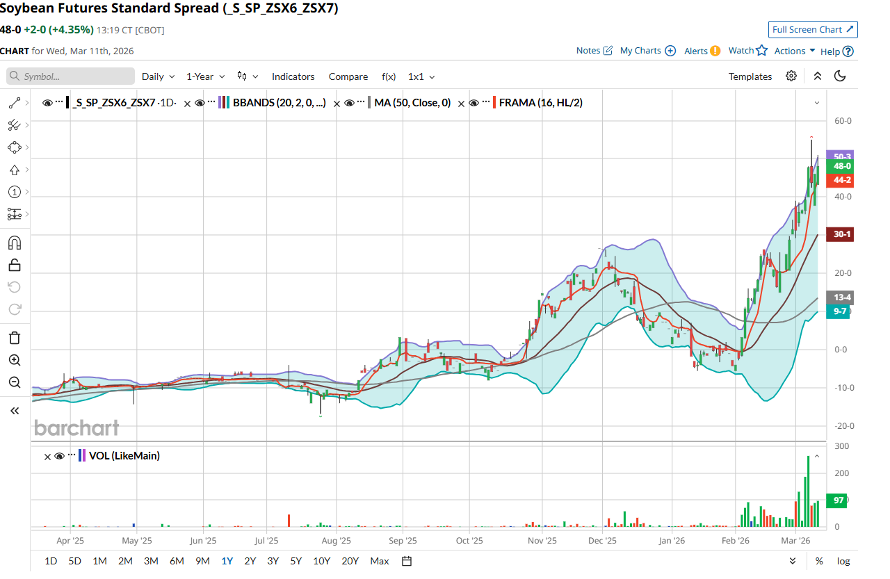 USDA offered no surprises in yesterday’s WASDE report. Somewhat expected. The more important report comes at month end in my view as planted and harvested acres and on farm stocks are released. With war raging in the Middle East there’s a lot of noise on how inhibited the fertilizer market could get with shipping lanes blocked and /or delayed. Soybeans in my view are less affected by fertilizer costs in their production than corn. While fertilizer quotes are clearly higher, so are corn prices. Depending on the area and operation, the corn rally has covered the increase in fertilizer costs in my opinion. The concern going forward is whether it has to continue to rally to cover any further increase in nitrogen prices. Additionally, the concern is whether the conflict in Iran is going to strike at ports that handle fertilizer. In my view the news just increases the talk of more corn acres going to beans. Planted and harvested acreage are expected to increase for the 26/27 crop season as China is back buying US origin for now. But now other concerns have risen with the war. The longer it goes, the greater the concern. Nov 26/Nov 27 bean spread below. This spread made a near term high at 55 cents Nov 26 over to start the week. I suspect anything over 50 cents over is worth investigating as it is over bought in my opinion. It is my belief that we should see prices and this spread retrace some as biofuel mandates finally come available while increased noise about less corn acres moving to beans gets louder. Trade idea below.