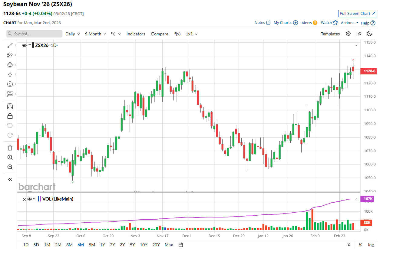 Beans finished lower with a potential downside reversal today as prices did not recover much by the close. Meal is significantly weaker from Friday, and bean oil has pulled back off its overnight highs. In addition, the US dollar had a strong day. There are rumors around today the Argentina President may be considering removing export taxes, one of his key campaign promises. This carries the possibility to create a wave of Argentina farmer selling should it occur.US soybean crush hit a new record high for the month of January at 227.859 million bushels. This was above the high-end of pre-report estimates. The January average is 197.759 million bushels. The US soybean crush pace hit a new record high for the month of January at 7.350 million bushels. The January average crush pace is 6.379 million bushels per day. Global shipping costs are no doubt rising swiftly. Part of today’s weakness was likely decreased optimism that China will buy any US beans in the near term after criticizing the US’s action in Iran. The current Managed Money net long in beans is the 2nd largest for the start of March in the past 10 years. China’s upcoming meeting with Trump could have a different tone, especially since its largest request has been over the US’s declared position on Taiwan. The trade is projecting a negative tone to soybean exports based on a more hostile meeting than expected before. Hence, some of the pressure on soybean futures today. Pre-report guesstimates for the March planting intentions report are higher harvested acres versus last year in beans in the 3-to-4-million-acre range higher year on year. Bean producers take note, near term downside hedge idea to consider into report.