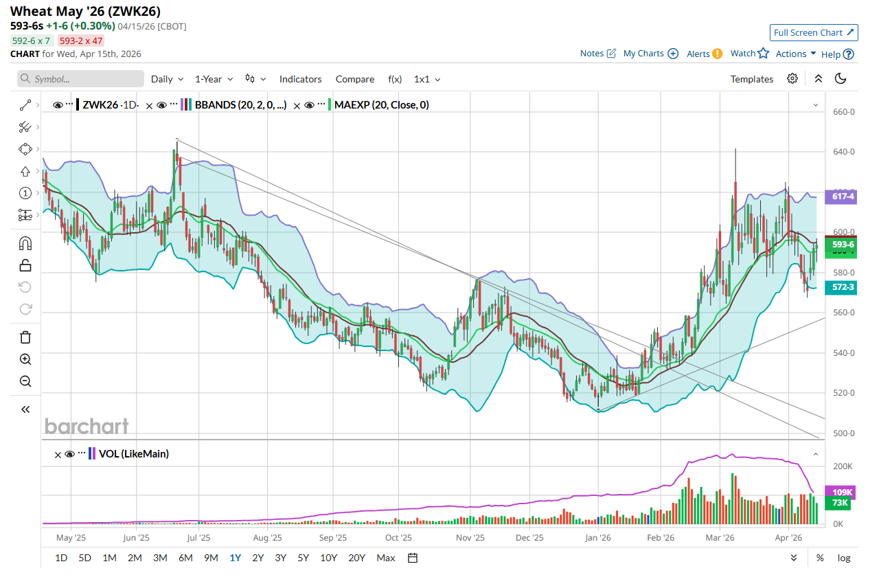 The wheat complex traded defensively overnight with additional pressure seen at the day session open. A two-sided market with the uncertain rain forecasts bringing the wheat market to the positive side in the second half of the session. Wheat posted a correction to start the session from yesterday’s gains but found support from elevated global demand and ongoing concerns over drought in the US Plains Sellers were unwilling to try and push values below their respective 20-day moving averages, which helped support the rebound in values. Again, no natural seller coupled with lingering drought-like conditions across 70% of the US wheat areas and cold temps for the weekend will keep values from breaking in my opinion. There was little fresh news on the Iranian war today with the US blockade in full effect. President Trump indicated the war is almost over today though, although he is planning no extension to the current ceasefire. Tomorrow’s weekly export estimates ranging from 75-250k tons old crop with same for new crop. Last week’s sales total 163k with 90k new crop. Funds are again net short Chicago wheat while being long KC. If precipitation chances deteriorate, we could leg higher amid fund short covering in Chicago. Trade Idea below.