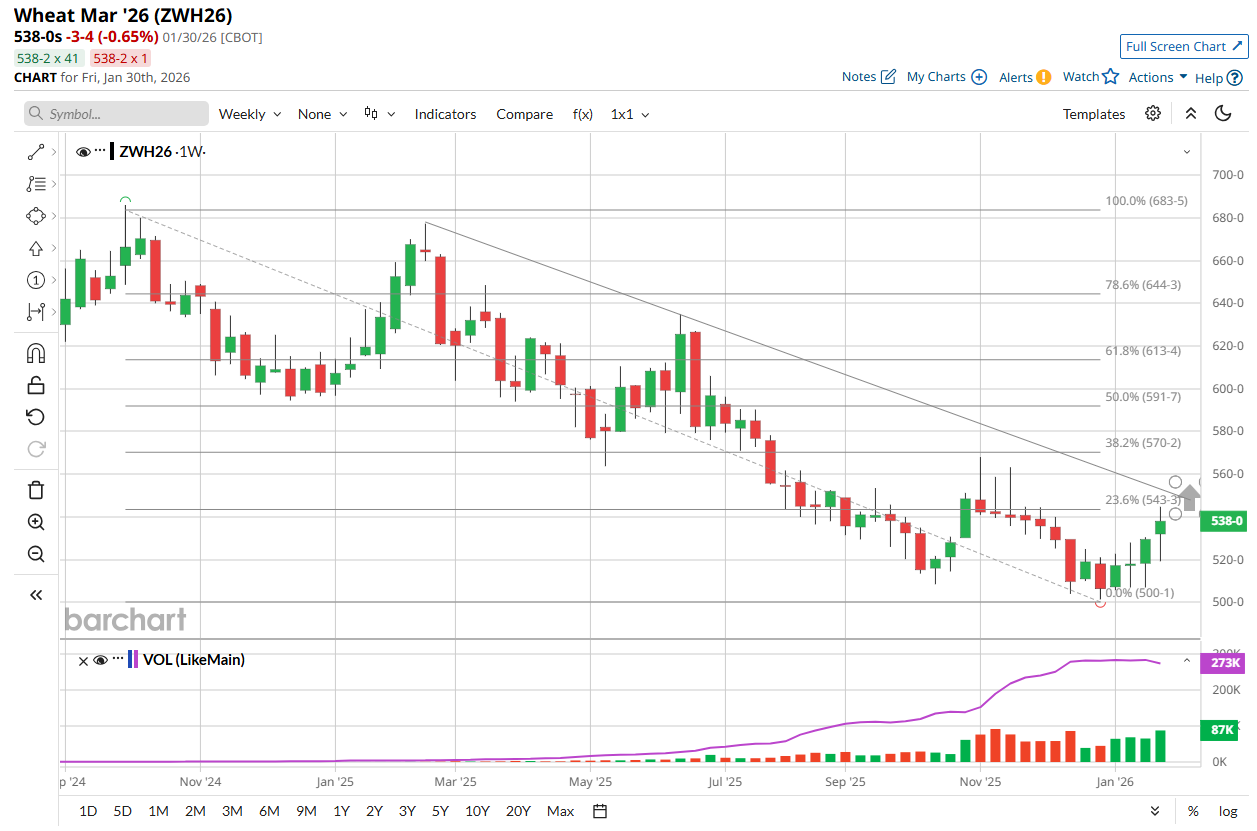 Winter wheat futures climbed to the highest mark in over two months due to concerns over production in the Black Sea and the Plains as frigid U.S. temps could hurt crops. Bitter cold temperatures over the past week over areas lacking sufficient snow cover put 15 to 20% of the U.S. winter wheat crop at risk of damage in my opinion, although the market will not receive the status of any possible damage until late March/early April. Most central and northern areas have sufficient snow cover to protect the wheat, but southern areas do not. The Black Sea Region is also expected to see readings drop below -20° F in some areas in the coming days. Multiweek highs were forged last week, which are at the top end of the three-month trading range. State-by-state condition ratings next week might show a struggling winter crop amid recent weather conditions, though a move above the October high could be a tall task. The bull needs to be fed here in my view to get the 94K Chicago wheat shorts to short cover.