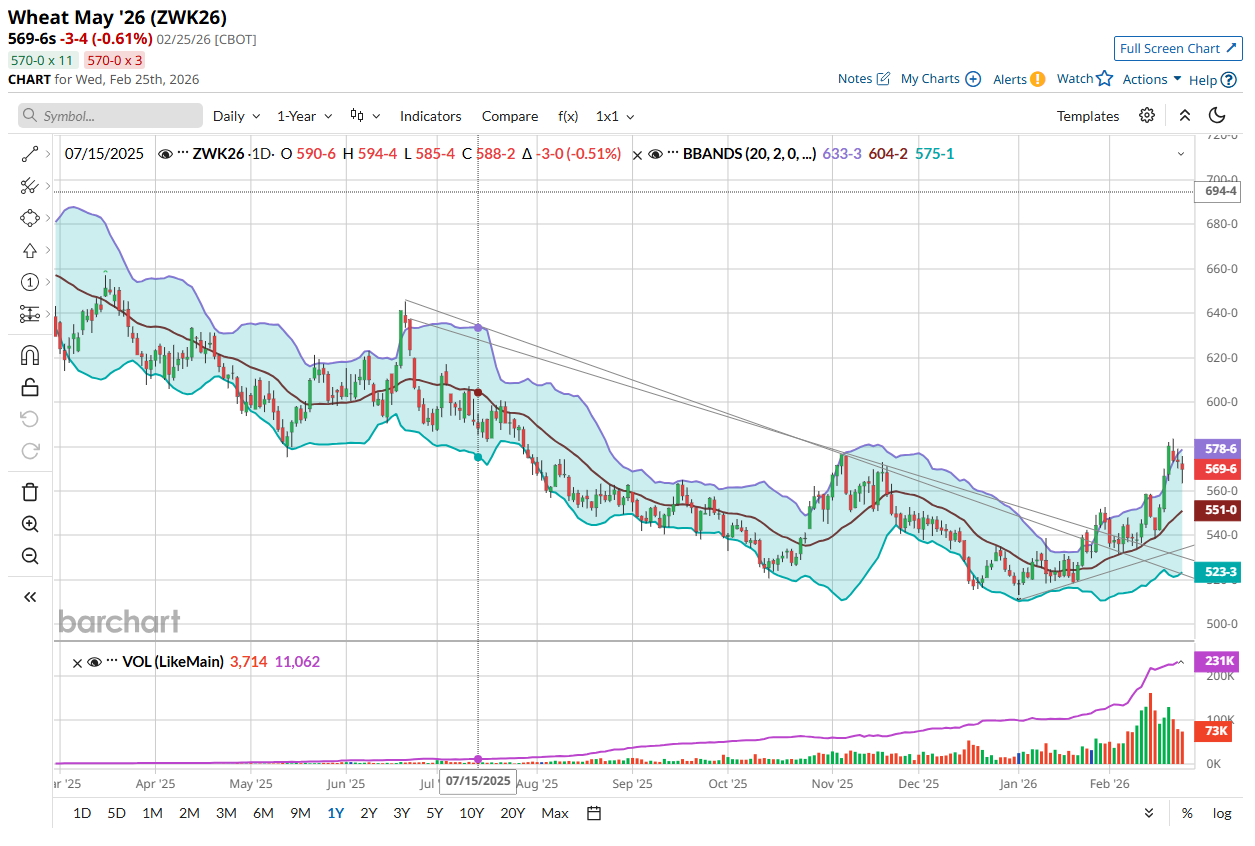 President Trump did not provide anything ag specific in his State of the Union last night, but as the situation with Iran unfolds, funds will continue to careful manicure their short exposure. Wheat is still the main commodity that is at the mercy of geopolitical developments both in the Middle East and Eastern Europe. The potential reactions can be expected during the overnight or over the weekend trade. if the upcoming talks lead to little action in terms of toning down the chances of a US strike, this market stays bid. However, for the fund manager, being short at 515 May futures have limited returns versus reentering shorts at the 570 area.US wheat FOB values are not the 1st or even second cheapest wheat on the board, and the US has to divest itself of 900-million-bushel carry of supplies this year. Weather, and its potential impact on future yields and the initial cause of the short covering rally maybe shifting. The drought talked up in the Southern Plains is seeing the models bringing in rains for the 6-15 period. These rains have to verify however and wart premium may keep the market bid unless the politicos can make a deal. Regardless of direction I don’t see the market staying at present levels. I see a retreat back to the 530 are or a move up to 6.30 by quarters end. Option idea below.