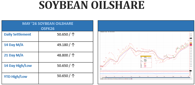 If you are not in the SOYBEAN-OIL SPREAD market yet, I suggest buying the AUG-DEC ’26 SOYBEAN-OIL SPREAD (ZLQ26-ZLZ26). This will now give you more time than the first two spreads and there will not be the need to roll a position.