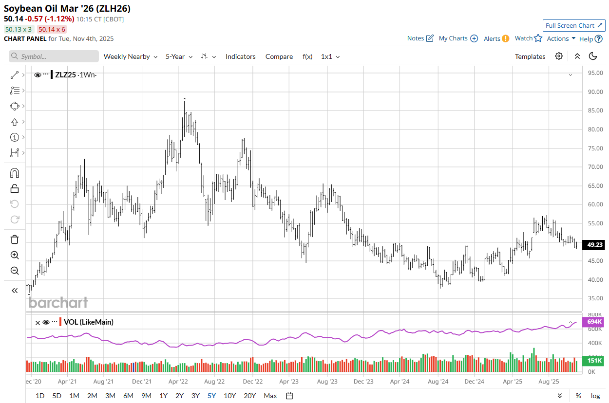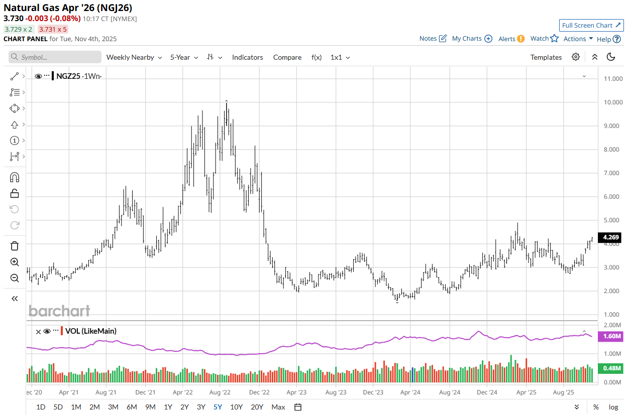 The Grain Markets were mixed today, with the Wheat contract trading higher. January’26 Soybeans pulled back a little today. January’26 Soybeans were 12 ¾ cents lower today and settled at 1121 ½. Today’s high was 1135 and the 1-month high 1135 ¾. Today’s low was 1112 ½ and the 1-month low is 1018 ½. Since 10/3 January’26 Soybeans are 84 ½ cents higher or more than 8%. December’25 Corn traded lower as well today. December’25 Corn was 2 ¾ cents lower today and settled at 431 ½. Today’s high was 434 ½ and the 1-month high is 437. Today’s low was 429 ¼ and the 1-month low is 409 ¼. Since 10/3 December’25 Corn is 12 ½ cents higher or almost 3%. The Wheat traded higher again today. December’25 Wheat was 6 ¾ cents higher today and settled at 550 ¼. Today’s high was 550 ½ and the 1-month high is 550 ½. Today’s low was 539 ¾ and the 1-month and contract low is 492 ¼. Since 10/3 December’25 Wheat is 35 cents higher or almost 7%. The Soybean Meal run as come to an end, and yesterday the Soybean Oil traded more than 1.00 higher on the day. There was a small pullback today, but that was a buying opportunity, and I did buy more. There is great upside potential in the Soybean Oil, and today I bought I the August’26 contract month. If the US Government reopens by the end of the week, there could be a flood of new market information announced. There have been several Trade Deals made with multiple countries over the last couple of weeks, and Grain purchases were included in those deals. We could see very positive news if the Government opens before the WASDE Report on Monday 11/10/25. I feel the whole Grain Complex is a buy, especially the Soybeans and Soybean Oil. I have a few Ideas on how to let long each Grain Contract before the end of the week, so you are prepared before the WASDE Report Monday morning. If you are interested, give me a call. I am still Bullish the Natural Gas Market as well. There are Trades in the Fats and Feeders below. Have a great night.
