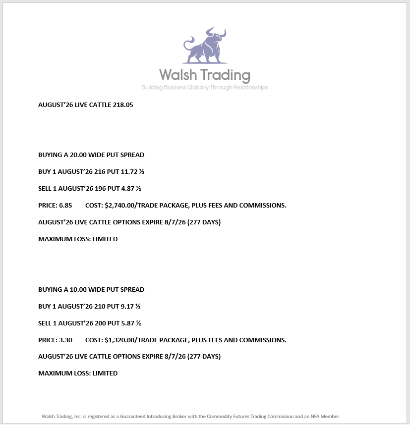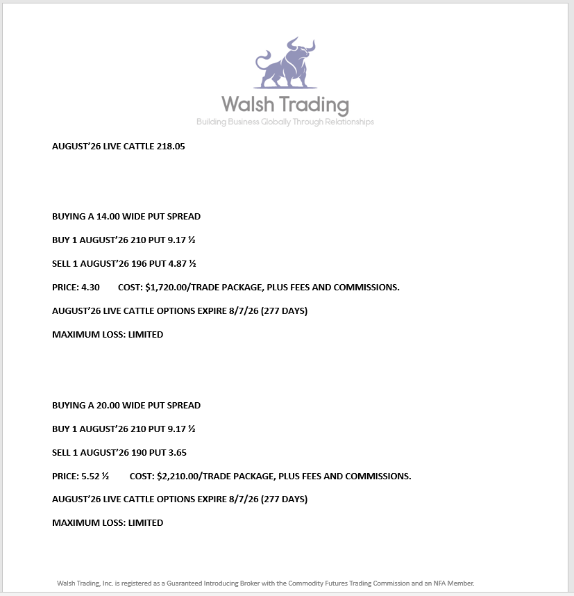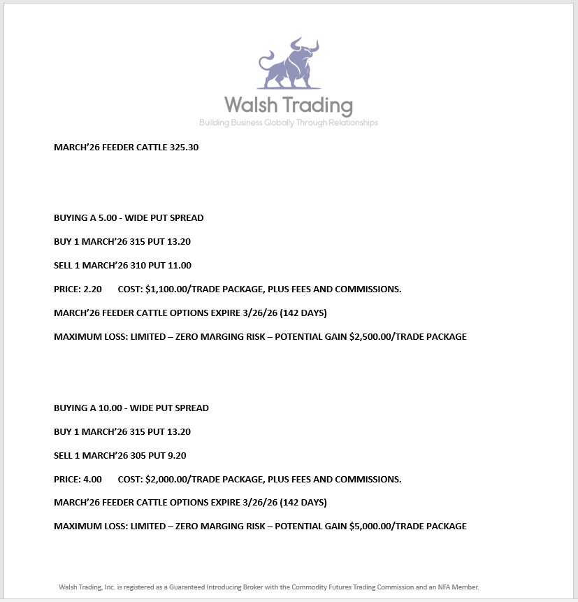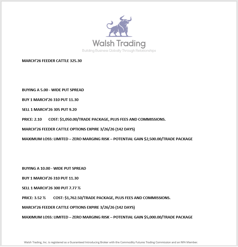 The Livestock Markets were all lower today, with the Cattle Markets falling fast. December’25 Live Cattle were 4.42 ½ lower today and settled at 227.77 ½. Today’s high was 232.97 ½ and the 1-month and contract high is 248.30. Today’s low was 227.25 and the 1-month low is 223.17 ½. Since 10/3 December’25 Live Cattle are 7.10 lower or more than 3%. The January’26 Feeders hit hard again. The January’26 Feeder Cattle were 7.30 lower today and settled at 329.22 ½. Today’s high was 339.97 ½ and the 1-month and contract high is 380.20. Today’s low was 328.15 and the 1-month low is 320.67 ½. Since 10/3 January’26 Feeder Cattle are 20.50 lower or almost 6%. The Hogs returned to trading lower today. December’25 Lean Hogs were 67 ½ cents lower today and settled 79.92 ½. Today’s high was 81.27 ½ and the 1-month high is 87.80. Today’s low was 79.37 ½ and that is the new 1-month low as well. Since 10/3 December’25 Lean Hogs are 7.37 ½ lower or more than 8%. Fear of the unknow continues to push the Cattle Markets lower. The US Southern Border will reopen eventually, tariffs could change sooner than later, the government could reopen by the end of the week, and who knows what new policy changes could be announced. This morning, an interview with Secretary Rollins was released, where she said President Donald Trump was “very focused” on reopening the border. That is likely to have contributed to the selloff in the Cattle Markets today. In addition, opening arguments on the legality of tariffs will begin tomorrow in the Supreme Court. The questions that the justices ask will be closely listened to, as there could be a “tell” on which way they are leaning, based on how, or what they ask. If it sounds like the court could rule against President Trump, it could affect the tariffs on Brazil, and another leg lower could begin in the Cattle Markets. Even if the court rules against his Presidential authority, nothing would be changed for months, but the thought of it changing could break the futures market further as well. December’25 Hogs traded to within 0.14 of the 50% retracement from the 52-week high/low of 79.23 ½. We will see if that number can hold as a support level, but I feel we can see the Hogs trade 5-dollars lower from here as well. Today I structured and sent out Feeder Cattle Trades. They are all Buying Put Spreads in March’26 Feeder Cattle and are shown below. I also structured and sent out Live Cattle Trades yesterday, and they are shown below as well. Give me a call if you are interested or have any questions. Have a great night.