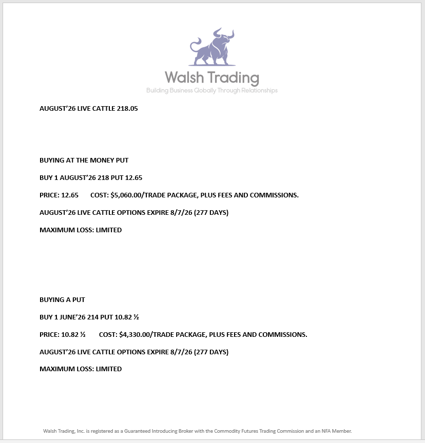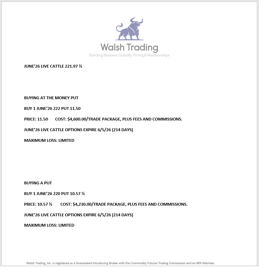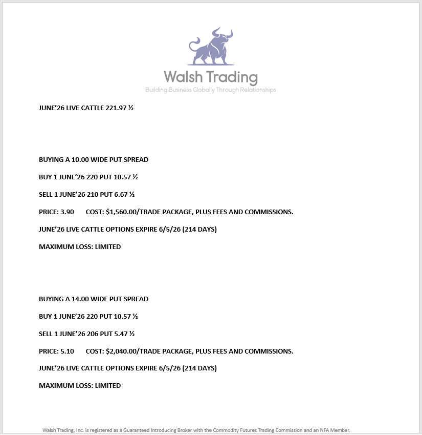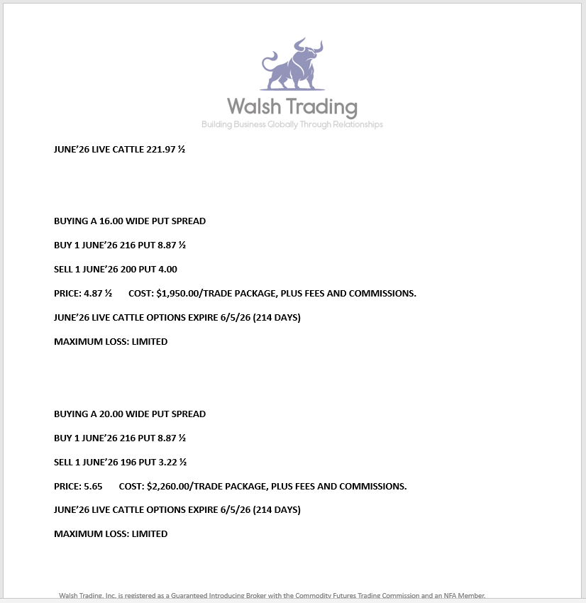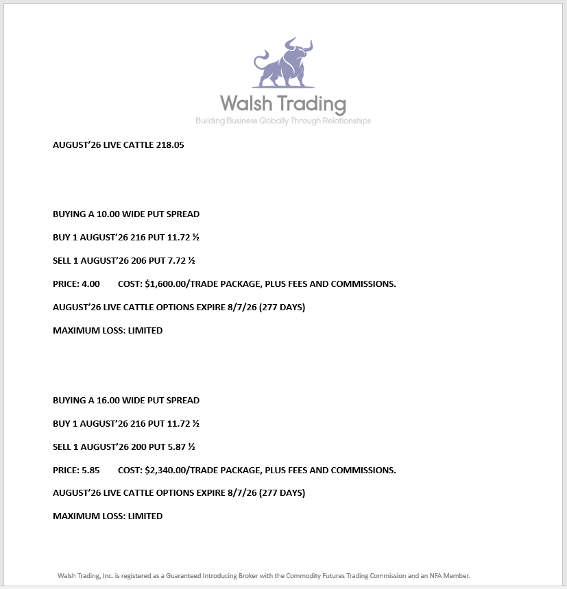 The Livestock Markets were all lower today, with the Cattle Markets falling fast. December’25 Live Cattle were 4.42 ½ lower today and settled at 227.77 ½. Today’s high was 232.97 ½ and the 1-month and contract high is 248.30. Today’s low was 227.25 and the 1-month low is 223.17 ½. Since 10/3 December’25 Live Cattle are 7.10 lower or more than 3%. The January’26 Feeders hit hard again. The January’26 Feeder Cattle were 7.30 lower today and settled at 329.22 ½. Today’s high was 339.97 ½ and the 1-month and contract high is 380.20. Today’s low was 328.15 and the 1-month low is 320.67 ½. Since 10/3 January’26 Feeder Cattle are 20.50 lower or almost 6%. The Hogs returned to trading lower today. December’25 Lean Hogs were 67 ½ cents lower today and settled 79.92 ½. Today’s high was 81.27 ½ and the 1-month high is 87.80. Today’s low was 79.37 ½ and that is the new 1-month low as well. Since 10/3 December’25 Lean Hogs are 7.37 ½ lower or more than 8%. Fear of the unknow continues to push the Cattle Markets lower. The US Southern Border will reopen eventually, tariffs could change sooner than later, the government could reopen by the end of the week, and who knows what new policy changes could be announced. This morning, an interview with Secretary Rollins was released, where she said President Donald Trump was “very focused” on reopening the border. That is likely to have contributed to the selloff in the Cattle Markets today. In addition, opening arguments on the legality of tariffs will begin tomorrow in the Supreme Court. The questions that the justices ask will be closely listened to, as there could be a “tell” on which way they are leaning, based on how, or what they ask. If it sounds like the court could rule against President Trump, it could affect the tariffs on Brazil, and another leg lower could begin in the Cattle Markets. Even if the court rules against his Presidential authority, nothing would be changed for months, but the thought of it changing could break the futures market further as well. December’25 Hogs traded to within 0.14 of the 50% retracement from the 52-week high/low of 79.23 ½. We will see if that number can hold as a support level, but I feel we can see the Hogs trade 5-dollars lower from here as well. Today I structured and sent out Feeder Cattle Trades. They are all Buying Put Spreads in March’26 Feeder Cattle and are shown below. I also structured and sent out Live Cattle Trades yesterday, and they are shown below as well. Give me a call if you are interested or have any questions. Have a great night.