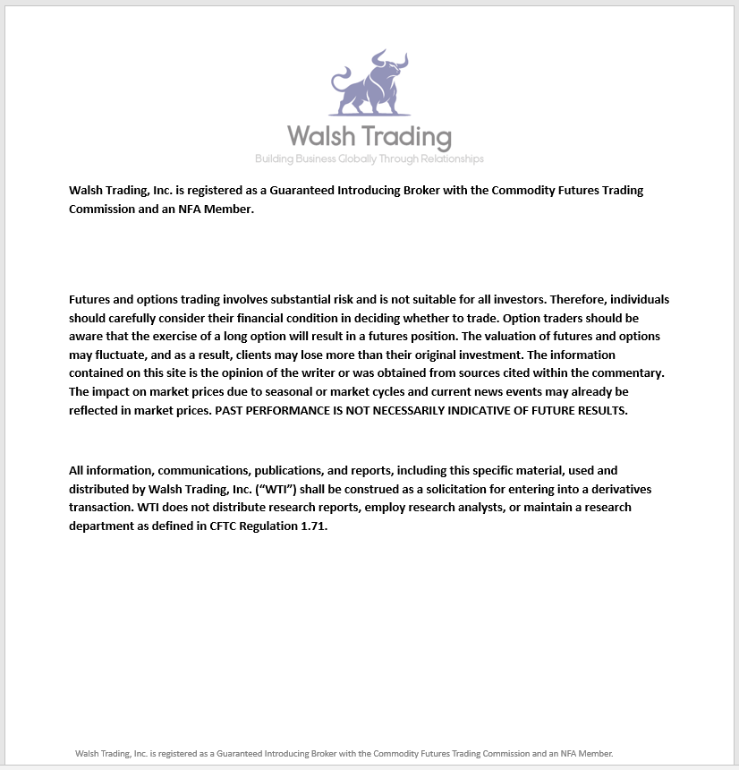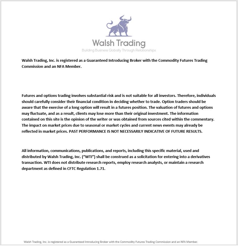 All information, communications, publications, and reports, including this specific material, used and distributed by Walsh Trading, Inc. (“WTI”) shall be construed as a solicitation for entering into a derivatives transaction. WTI does not distribute research reports, employ research analysts, or maintain a research department as defined in CFTC Regulation 1.71.