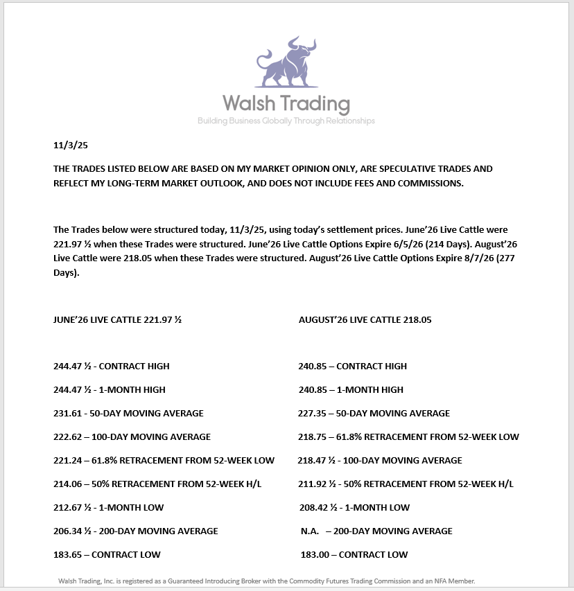 LIVE CATTLE TRADES STRUCTURED YESTERDAY 11/3/25 BELOW – IF YOU WOULD LIKE TO SEE MY TRADE RECOMMENDATIONS RIGHT AFTER THEY ARE STRUCTURED – JUST SEND ME AN EMAIL