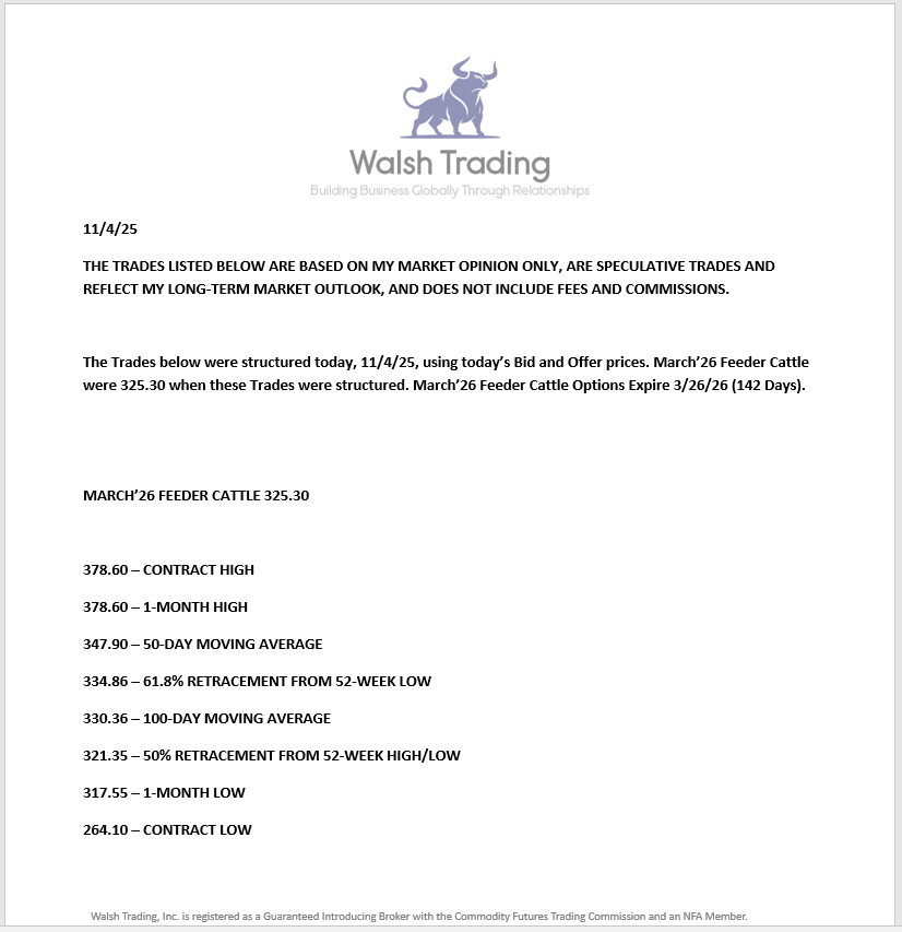 FEEDER CATTLE TRADES STRUCTURED TODAY 11/4/25 BELOW – IF YOU WOULD LIKE TO SEE MY TRADE RECOMMENDATIONS RIGHT AFTER THEY ARE STRUCTURED – JUST SEND ME AN EMAIL