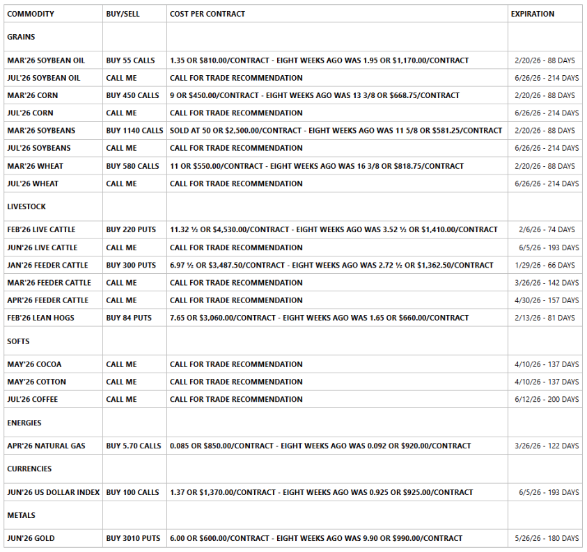 The Livestock Markets were mixed today, with the Feeders closing a couple Dollars higher. February’26 Live Cattle were 20 cents lower today and settled at 207.32 ½. Today’s high was 208.80 and the 1-month high is 232.30. Today’s low was 204.32 ½ and that is the new 1-month low as well. Since 10/24 February’26 Live Cattle are 26.10 lower or more than 11%. The January’26 Feeders bounced well off the lows today. The January’26 Feeder Cattle were 2.10 higher today and settled at 307.07 ½. Today’s high was 309.47 ½ and the 1-month high is 340.50. Today’s low was 299.52 ½ and that is the new 1-month low as well. Since 10/24 January’26 Feeder Cattle are 41.10 lower or almost 12%. The Hogs gave a little back today. February’26 Lean Hogs were 17 ½ cents lower today and settled 79.00. Today’s high was 79.90 and the 1-month high is 84.90. Today’s low was 78.77 ½ and the 1-month low is 77.12 ½. Since 10/24 February’26 Lean Hogs are 5.30 lower or more than 6%. The Fats and the Feeders were both locked limit down yesterday, and this morning they both set new 1-month lows. The February’26 Fats bounced 3-Dollars off the lows today and settled just 20 cents lower. The January’26 Feeders traded below the 300 level this morning, but not for long. The January’26 Feeders bounced 7.55 off the low today and settled 2.10 higher on the day. As you know, I had been waiting for a big pullback in the Cattle Markets, and that has taken place. Now there could be a race to the top, and the 350 level could be back sooner than you might think. I am now Bullish the Cattle Markets, and my 305 level in the January’26 Feeders was hit and traded through, and any shorts I still had on were exited. I am looking forward to the potential run higher from here. I started buying Calls and Call Spreads and Selling Puts and Put Spreads in the Feeders yesterday and continued to do it again today. The Brazilian Tariff removal came as a surprise, and the Cattle Markets were punished for it, but they look strong now. Even when they decide when the US Southern Border will be reopened the Cattle from Mexico, I feel that negative pricing event could now be factored into these markets. If the Cattle Markets break whenever they make an announcement, I feel it will be a buying opportunity. If the Hog want to participate on a run higher, I feel they might need to break a few more dollars first. If the Cattle on Feed Report was accurate, then there could be a substantial move higher yet to come. I would like to work with you, and I have many ways to play the Cattle Markets moving forward. Give me a call if you have any questions. I will be in Amarillo December 1-5 as well if you would like to meet there.