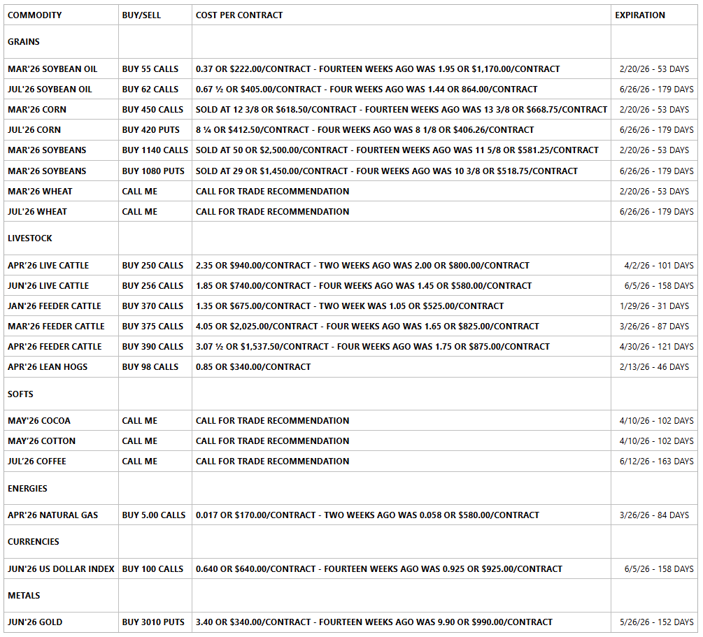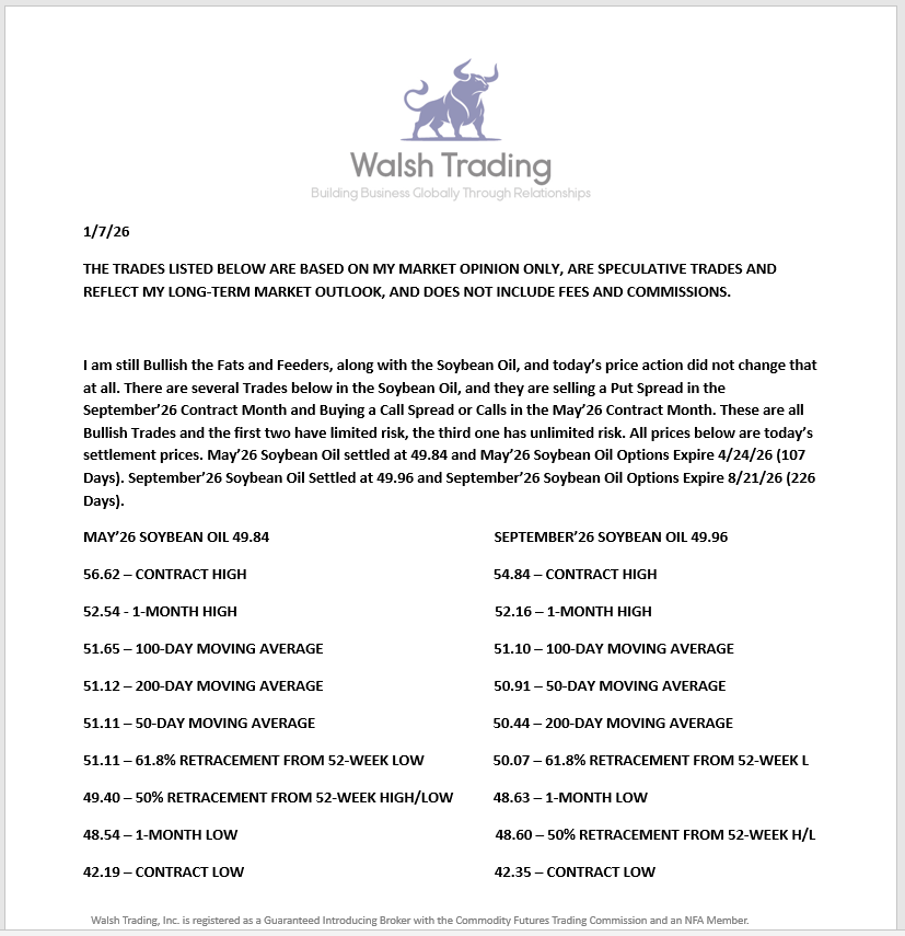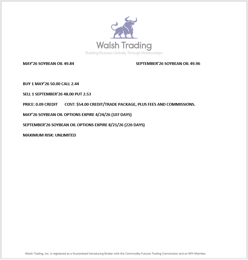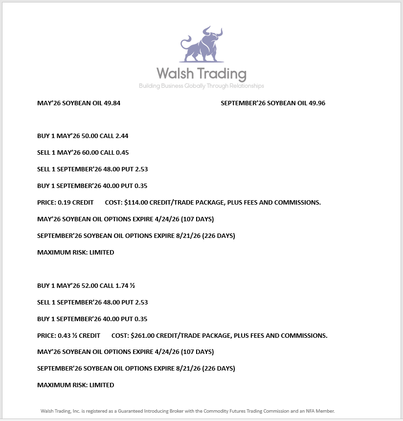 The Grain Markets were all lower or unchanged today, and once again did not close well. March’26 Soybeans were 5 ¾ cents lower today and settled at 1061 ¼. Today’s high was 1067 ¾ and the 1-month high is 1106 ¾. Today’s low was 1060 ¾ and the 1-month low is 1038. Since 12/8 March’26 Soybeans are 44 ½ cents lower or more then 4%. March’26 Corn closed a little lower today. March’26 Corn was ¾ of a cent lower today and settled at 446. Today’s high was 448 and the 1-month high is 453. Today’s low was 445 ½ and the 1-month low is 435 ½. Since 12/8 March’26 Corn is 2 ¼ cents higher or fractionally higher. The Wheat did not do much again and settled unchanged on the day. March’26 Wheat was unchanged today and settled at 518. Today’s high was 522 ¾ and the 1-month high is 537 ¾. Today’s low was 515 ¾ and the 1-month and contract low is 501 ½. Since 12/8 March’26 Wheat is 16 ¾ cents lower or more than 3%. Crude Oil shot higher after the Grains closed today and is currently 2.59 higher on the day in the March’26 Futures. If the Crude Oil can keep this level or higher, it could lite a fire under the Soybean Oil. The Bean Oil looks ready to charge ahead and could leave the rest of the Grains behind for a while. Indonesia, the world’s largest producer of Palm Oil, has come out with a new plan to seize 4 or 5 million hectares of private plantations of Palm Oil. This is in addition to the more than 4 million hectares the Indonesia government seized and put under government control last year. Obviously, they must know they have a problem, and there might not be enough to go around. Indonesia also has a mandatory 40% Palm Oil biofuel blend rate and plans to increase that palm oil blend rate to 50% this year. Export taxes on Palm Oil have also increased and are currently 10%. This alone could make all vegetable oils much more expensive, and if they have a possible export ban, then Soybean Oil and Canola Oil could shoot to the moon. More Palm Oil plantation seizures just ahead of a blend rate increase sends the signal that stocks could drop quickly, and they could inevitably be short of what they need. Malaysia also plans on increasing its Palm Oil biofuel blend rate this year, and Brazil is increasing its Soybean Oil Biofuel blend rate this year as well. It is all setting up what could be a dramatic price increase in the vegetable oil markets. The US government is supposed to release their blend rate later this month, and I feel we could see an increase here as well. Today’s weekly export sales for Soybean Oil were above the highest estimates, and for the 2025/2026 marketing year sales have reached over 70% of the USDA forecast, and the 5-year average for this time of year is just over 40%. It looks like the buying has begun. Today, May’26 Soybean Oil closed at 49.97 and I feel it could trade into the mid to high 50’s, with the September’26 contract month in the 60’s. May’26 Soybean Oil Options Expire 4/24/26 (106 Days). Give me a call if you are interested.