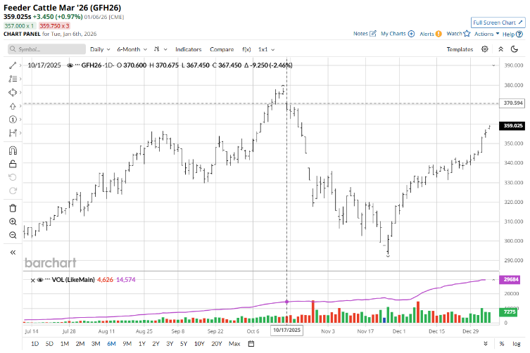 WATCH IF THE NEXT GAP WILL BE FILLED IN THE MARCH’26 FEEDER CATTLE @ 376.70 – CONTRACT HIGH IS 378.60