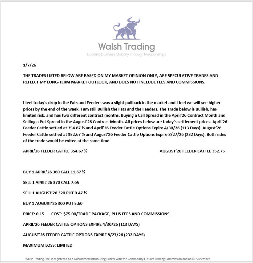 The Livestock Markets were all higher today and looked good going into the close. February’26 Live Cattle were 75 cents higher today and settled at 235.27 ½. Today’s high was 235.82 ½ and the 1-month high is 237.45. Today’s low was 233.12 ½ and the 1-month low is 225.65. Since 12/8 February’26 Live Cattle are 8.60 higher or almost 4%. The March’26 Feeders gained a couple dollars today and are within striking distance of 1-month high and the 360 level. The March’26 Feeder Cattle were 2.22 ½ higher today and settled at 357.72 ½. Today’s high was 358.30 and the 1-month high is 359.40. Today’s low was 353.35 and the 1-month low is 327.72 ½. Since 12/8 March’26 Feeder Cattle are 27.30 higher or more than 8%. The Hogs gained more than a dollar today. February’26 Lean Hogs were 1.07 ½ higher today and settled at 85.87 ½. Today’s high was 86.35 and the 1-month high is 86.50. Today’s low was 84.80 and the 1-month low is 80.65. Since 12/8 February’26 Lean Hogs are 3.47 ½ higher or more than 4%. The Fats and the Feeders both opened higher today, but the market broke after a while, only to bounce off the lows of the day and close near the highs of the day. I still feel the Cattle Market can make a run at the contract highs. The path higher is easier this time as the tracks have already been laid. According to Bloomberg, Brazil is about to begin a cycle of tight supply in the Cattle Market. They have reported that the price for calves is increasing in Brazil, as Heifers are being retained to rebuild the herds. Yesterday, I saw a second source that stated Brazil’s beef production is expected to be down 2% in 2026. This, along with the tight cattle numbers domestically makes me think there could be another run higher in both the Fats and the Feeders. I feel the next move higher could be to fill the remaining gaps above. There is still one gap yet to be filled in the Fats and the Feeders, and they both sit just below the contract highs. For the Gap to be filled in the February’26 Live Cattle it needs to trade 249.55. That price is 14.27 ½ higher from today’s settlement price, and just 62 ½ cents below the contract high of 250.17 ½. In the March’26 Feeders the gap would be filled if 376.70 was traded. That price is 18.97 ½ higher from today’s settlement price, and just 1.90 below the contract high of 378.60. We will soon see if the Market can rally that high again, and a strong cash market will certainly help. The Feeder Cattle Index continues to climb as well, and it jumped another 4.92 today, up to 368.07. The February’26 Hogs bounced back today, and I still like them trading higher from here. There are charts below, and they show where the Gaps are in the Fats and the Feeders, along with a few new trade examples. It’s time to get your account open, so give me a call and I will answer any questions you have. Have a great night.