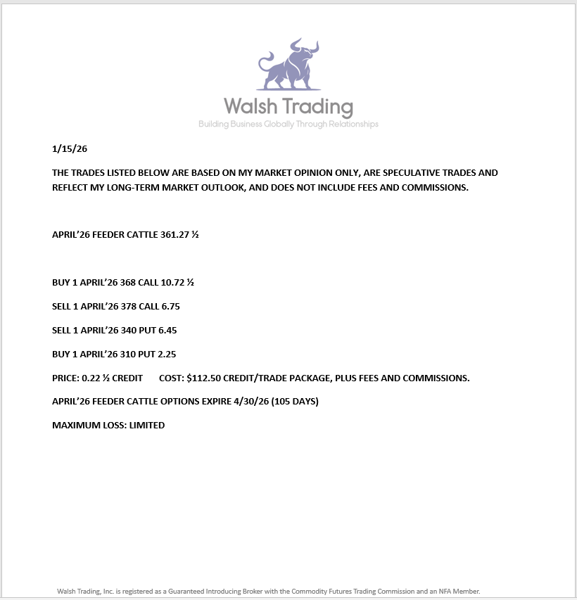 The Livestock Markets came alive again today and looked very strong before the close, settling just below the highs of the day. April’26 Live Cattle were 1.10 higher today and settled at 238.42 ½. Today’s high was 238.55 and the 1-month high is 239.05. Today’s low was 237.22 ½ and the 1-month low is 226.60. Since 12/15 April’26 Live Cattle are 8.40 higher or more than 3 ½%. The March’26 Feeders charged ahead today and settled almost 5 bucks higher. The March’26 Feeder Cattle were 4.85 higher today and settled at 364.55. Today’s high was 364.67 ½ and that is the new 1-month high as well. Today’s low was 359.32 ½ and the 1-month low is 331.35. Since 12/15 March’26 Feeder Cattle are 29.70 higher or almost 9%. The Hogs gained over 2-dollars today. April’26 Lean Hogs were 2.30 higher today and settled at 95.00. Today’s high was 95.15 and that is the new 1-month high as well. Today’s low was 92.50 and the 1-month low is 87.62 ½. Since 12/15 April’26 Lean Hogs are 6.07 ½ higher or almost 7%. I do not have much new information to add. I feel we will be approaching the gap above very soon. Soybean exports were very strong last week. My Trade recommendations are doing very well, and I believe there is much more upside to come. Let’s get your account open now. The Cattle Markets are starting to run higher, and I feel the next stop higher could be the one remaining gap that has not been filled yet. The gaps above in both the Fats and Feeders sit just below the contract highs, and I feel we could trade there sooner than later. For the Gap to be filled in the February’26 Live Cattle, 249.55 would need to be traded, and that is only 12.30 above today’s settlement price. For the gap to be filled in the March’26 Feeders, 249.55 would need to be traded, and that is only 14.57 ½ above today’s settlement price. This is what I said last Thursday 1/8/26 “The Fats and the Feeders both opened higher today, but the market broke after a while, only to bounce off the lows of the day and close near the highs of the day. I still feel the Cattle Market can make a run at the contract highs. The path higher is easier this time as the tracks have already been laid. According to Bloomberg, Brazil is about to begin a cycle of tight supply in the Cattle Market. They have reported that the price for calves is increasing in Brazil, as Heifers are being retained to rebuild the herds. Yesterday, I saw a second source that stated Brazil’s beef production is expected to be down 2% in 2026. This, along with the tight cattle numbers domestically makes me think there could be another run higher in both the Fats and the Feeders. I feel the next move higher could be to fill the remaining gaps above. There is still one gap yet to be filled in the Fats and the Feeders, and they both sit just below the contract highs. For the Gap to be filled in the February’26 Live Cattle it needs to trade 249.55. That price is 14.27 ½ higher from today’s settlement price, and just 62 ½ cents below the contract high of 250.17 ½. In the March’26 Feeders the gap would be filled if 376.70 was traded. That price is 18.97 ½ higher from today’s settlement price, and just 1.90 below the contract high of 378.60. We will soon see if the Market can rally that high again, and a strong cash market will certainly help.” I like the April’26 and May’26 Feeder Cattle Markets, and I feel we could see new contract highs in both contract months quicker than you might think. I would like to work with you, and a simple phone call can start the process. The April’26 Hogs rallied today, and I still like them trading higher from here. There are charts below, and they show where the Gaps are in the Fats and the Feeders, along with a few new trade examples (FROM LAST WEEK). I have new Trades on my desk, give me a call if you would like to see them. It’s time to get your account open, so give me a call and I will answer any questions you have. Have a great night.