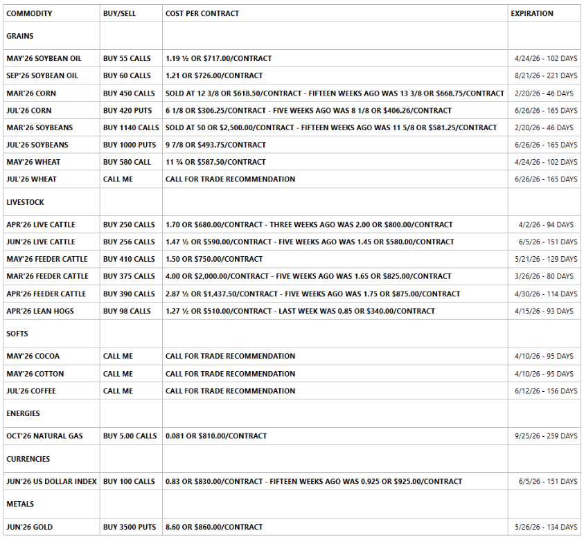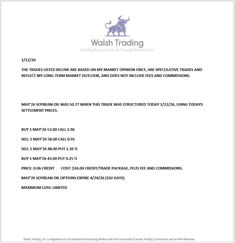 The Grain Markets were mixed today, and the Soybeans were higher on strong export numbers last week, and a small cut to Brazilian production estimates. The Corn and the Wheat did not close well again. March’26 Soybeans were 10 ½ cents higher today and settled at 1053. Today’s high was 1058 ¼ and the 1-month high is 1086. Today’s low was 1041 ½ and the 1-month low is 1037 ¾. Since 12/15 March’26 Soybeans are 28 ¼ cents lower or more then 2%. March’26 Corn closed a little lower again today. March’26 Corn was 1 ¾ cents lower today and settled at 420 ¼. Today’s high was 425 and the 1-month high is 453. Today’s low was 420 and the 1-month low is 417 ¼. Since 12/15 March’26 Corn is 19 ½ cents lower or more than 4%. The Wheat broke again and settled a little lower. March’26 Wheat was 2 cents lower today and settled at 510 ½. Today’s high was 517 ¼ and the 1-month high is 528. Today’s low was 509 ¾ and the 1-month and contract low is 501 ½. Since 12/15 March’26 Wheat is 10 ¼ cents lower or almost 2%. Not much new here, and I still feel the Soybeans can drift lower and the Corn could soon see 400. Soybean Oil stocks were released today, and they were below estimates… It could be a special year in the Soybean Oil. The Wheat is a wild card and settled just 9 cents above the contract low again. If the Wheat makes a new contract low, I recommend buying it. This is what I said last week 1/8/26 “The Bean Oil looks ready to charge ahead and could leave the rest of the Grains behind for a while. Indonesia, the world’s largest producer of Palm Oil, has come out with a new plan to seize 4 or 5 million hectares of private plantations of Palm Oil. This is in addition to the more than 4 million hectares the Indonesia government seized and put under government control last year. Obviously, they must know they have a problem, and there might not be enough to go around. Indonesia also has a mandatory 40% Palm Oil biofuel blend rate and plans to increase that palm oil blend rate to 50% this year. Export taxes on Palm Oil have also increased and are currently 10%. This alone could make all vegetable oils much more expensive, and if they have a possible export ban, then Soybean Oil and Canola Oil could shoot to the moon. More Palm Oil plantation seizures just ahead of a blend rate increase sends the signal that stocks could drop quickly, and they could inevitably be short of what they need. Malaysia also plans on increasing its Palm Oil biofuel blend rate this year, and Brazil is increasing its Soybean Oil Biofuel blend rate this year as well. It is all setting up what could be a dramatic price increase in the vegetable oil markets. The US government is supposed to release their blend rate later this month, and I feel we could see an increase here as well. Today’s weekly export sales for Soybean Oil were above the highest estimates, and for the 2025/2026 marketing year sales have reached over 70% of the USDA forecast, and the 5-year average for this time of year is just over 40%. It looks like the buying has begun. Today, May’26 Soybean Oil closed at 49.97 and I feel it could trade into the mid to high 50’s, with the September’26 contract month in the 60’s. May’26 Soybean Oil Options Expire 4/24/26 (106 Days).” It was reported today that Palm Oil production in Malaysia last month was down 5 ½% from the prior month. This has already tightened the Palm Oil supply. In the same time frame, shipments rose over 8%. It was also reported that exports of Palm Oil products rose a staggering 17%-29% over the first 10-days of this year when compared to December. India is expected to start buying Palm Oil this month, as their purchases were low in December. In addition to this, it looks like China and Indonesia could start buying Palm Oil as well this month. With a low supply, and a high demand, the price of Palm Oil looks like it could soon be out of reach, making other vegetable much more attractive, especially the Soybean Oil and the Canola Oil. I will say it again, this could be a very special year for the Soybean Oil Market, as prices have already started to rise, and the May’26 Soybean Oil was almost 2% higher today alone. I have new trades with incredible risk/reward ratios. Give me a call if you would like to know more. Have a great night.