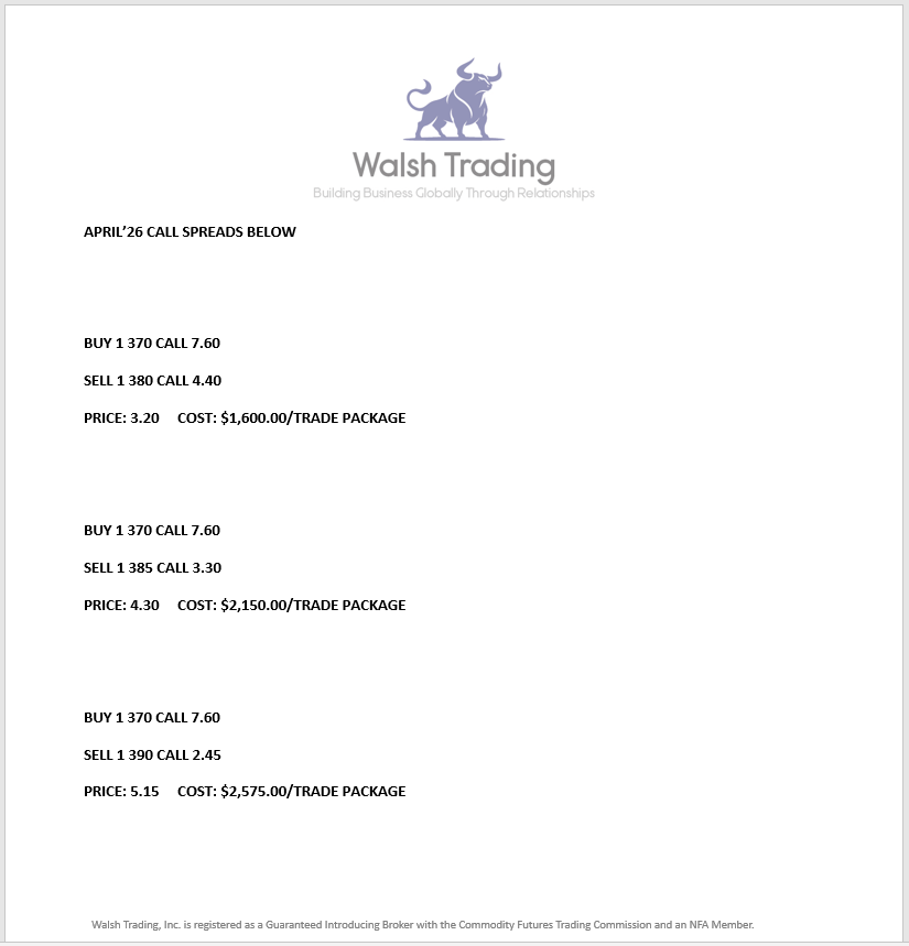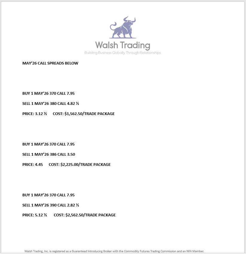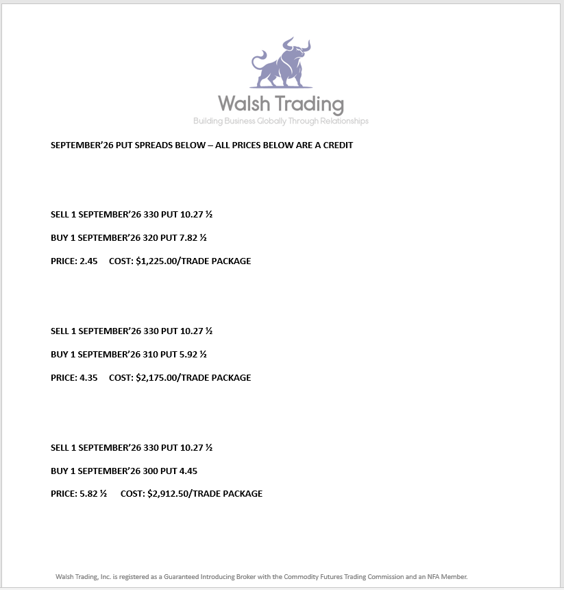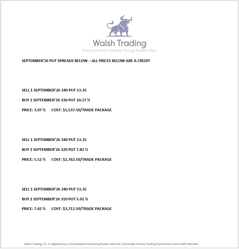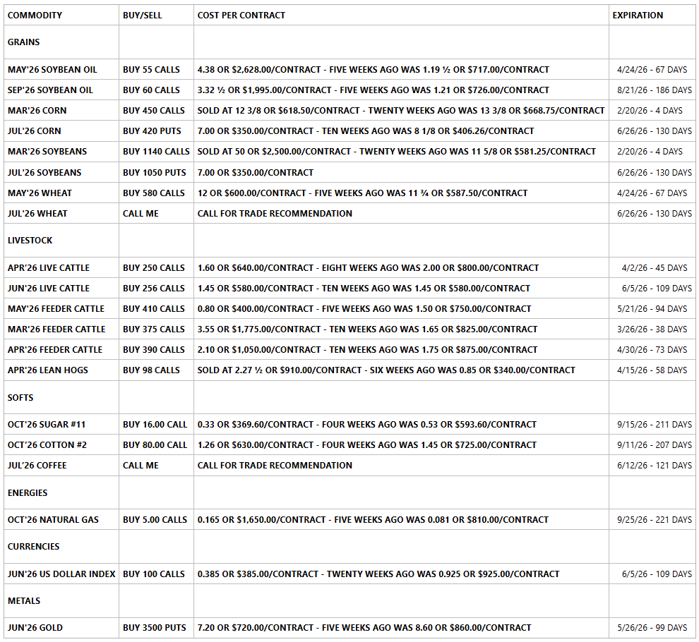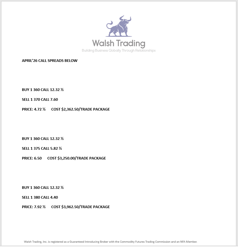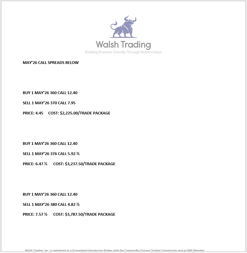 The Grain Markets were mixed today, with only the Beans closing higher, and the Corn and Wheat sinking lower. May’26 Soybeans were ¼ of a cent higher today and settled at 1048 ¾. Today’s high was 1053 ¾ and the 1-month high is 1156 ¼. Today’s low was 1141 and the 1-month low is 1141. Since 1/16 May’26 Soybeans are 80 cents higher or almost 7 ½%. May’26 Corn followed the Wheat lower today. May’26 Corn was 6 ¼ cents lower today and settled at 435 ¾. Today’s high was 441 ¼ and the 1-month high is 443 ¾. Today’s low was 435 ¼ and the 1-month low is 429 ½. Since 1/16 May’26 Corn is 3 ¾ cents higher or almost 1%. The Wheat Market took a dive today. May’26 Wheat was 6 cents lower today and settled at 542 ½. Today’s high was 548 and the 1-month high is 558 ¾. Today’s low was 538 ¾ and the 1-month low is 518 ½. Since 1/16 May’26 Wheat is 13 ¾ cents higher or more than 2 ½%. The Soybean Oil still looks great to me, but the Soybeans look overvalued. The NOPA crush report was released this morning, and it was above estimates. That, along with the Soybean Oil kept the Beans positive on the day. I think the Beans can break sometime soon, and I like the July’26 1050 Puts, and they settled at 6 7/8 today. The Brazilian crop will be huge, and the games with China maybe buying more will be over sooner than later. Unless there is a planting issue here this spring, I feel we can see Soybean prices start to decline soon. If you have not hedged your Soybeans yet, I recommend doing now, and an OTC Structured Produce could be perfect right now, as it will allow you to sell above current price levels. If you have any interest in hedging now, or would like more information on the OTC Products, give me a call and I can have something designed specifically for you. The Corn Market is a contract I do not see moving much anytime soon. I like selling the July’26 440 Straddle and collecting 38 ¼ cents. The Wheat Market was lower today after Russian Ports were bombed by Ukraine last night, so that Market can move in any direction at any time. I am staying away from the Wheat but would rather buy it than sell it. The Soybean Oil I feel is the trade to have on, and today the May’26 futures traded to within 0.25 of the contract high of 58.34. I have also increased my Soybean Oil Target Level to 65.00. The Soybean Oil Future Spreads and Option Spreads have been working very well, and I put more of them on today. The August’26/December’26 Future and Option Spreads are ready to take off again. Give me a call if you are interested, and I will show what I am thinking. This year could be one to remember, with the way several of these commodity contracts are lining up. Call me and I will show you how easy it is to open an account and walk you through the process. I look forward to hearing from you. Have a great night.