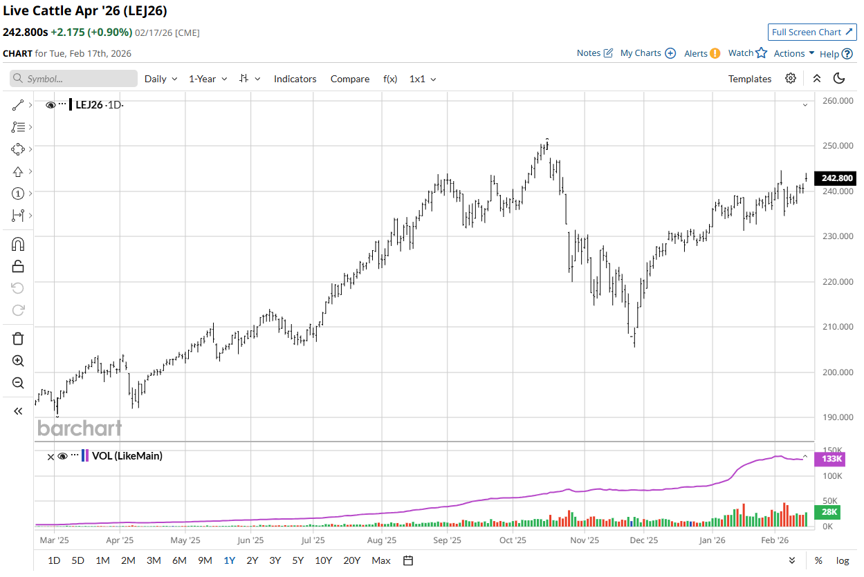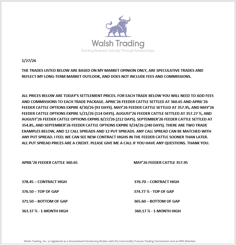The Cattle Markets charged ahead again today. April’26 Live Cattle were 2.17 ½ higher today and settled at 242.80. Today’s high was 244.00 and the 1-month high is 244.57 ½. Today’s low was 242.10 and the 1-month low is 232.65. Since 1/16 April’26 Live Cattle are 8.82 ½ higher or almost 4%. The March’26 Feeders were almost 5 bucks higher today. The March’26 Feeder Cattle were 4.82 ½ higher today and settled at 370.97 ½. Today’s high was 372.25 and the 1-month high is 373.60. Today’s low was 368.92 ½ and the 1-month low is 354.55. Since 1/16 March’26 Feeder Cattle are 14.52 ½ higher or more than 4%. The Hogs traded more than a dollar higher today. April’26 Lean Hogs were 1.02 ½ higher today and settled at 92.30. Today’s high was 93.00 and the 1-month high is 99.80. Today’s low was 91.50 and the 1-month low is 91.12 ½. Since 1/16 April’26 Lean Hogs are 2.90 higher or more than 3%. Having any fun yet? The cash market was very strong on Friday after the close, and today I heard that the cash market traded 250.00 in Iowa, but waiting for confirmation. The Cattle Markets are on fire, and I feel there is still room to run higher. The Gap above in the April’26 Fats starts at 246.25 and the top of the gap is 4.00 higher at 250.25. The April’26 Fats closed a couple bucks+ higher today and traded to within 57 ½ cents of the 1-month high of 244.57 ½ on the highs today. Today’s settlement price of 242.80 is 1.77 ½ below the 1-month high, 3.45 below the bottom of the Gap above, 7.45 below the top of the Gap above, and 8.12 ½ below the contract high. The Gap in the March’26 Feeders starts at 370.60 and settled above that today. The top of the Gap is 6.10 higher from the start at 376.70. The March’26 Feeders closed almost 5.00 higher today, and above the bottom of the Gap, which I think is important. Today’s settlement in the March’26 Feeders is 2.62 ½ below the 1-month high, 5.72 ½ below the top of the gap, and 7.62 ½ below the contract high. I still think we can see the Gaps above get filled in the Fats and the Feeders, challenge contract highs, trade through them, and then repeatedly establish new contract highs for a while. There will be pullbacks in the Market, if new highs are made, but I am not looking for a correction yet. Unless something unforeseen happens (which is always possible) I think we can see higher prices into June and then reevaluate everything. I still recommend putting on Bullish Option trades, that have limited and defined risk. If you have not been a part of the upside in the Cattle Markets yet, I still feel there is time, and a $50.00 rally in the Feeders from today’s settlement price looks possible to me. I am structuring new trades now, so give me a call if you are interested.
