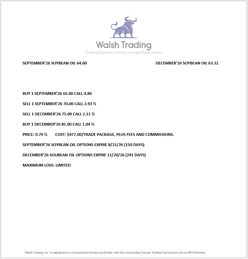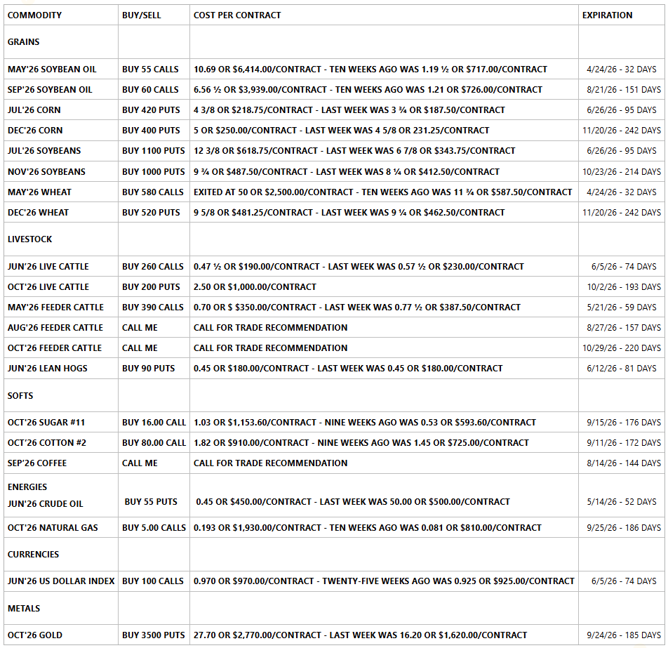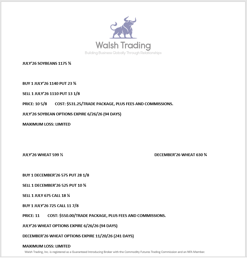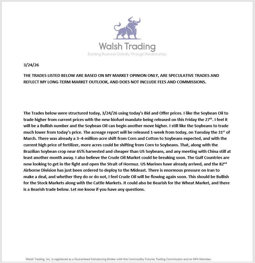 The Grain Markets were mixed today, with the Soybeans trading lower. May’26 Soybeans were 8 ½ cents higher today and settled at 1155. Today’s high was 1166 ¾ and the 1-month and contract high is 1238 ¾. Today’s low was 1155 ¾ and the 1-month low is 1145 ¼. Since 2/24 May’26 Soybeans are ¼ of a cent higher or fractionally higher. May’26 Corn picked up a few cents today. May’26 Corn was 3 cents higher today and settled at 462 ½. Today’s high was 465 ¾ and the 1-month high is 476. Today’s low was 459 and the 1-month low is 438. Since 2/24 May’26 Corn is 24 cents higher or almost 5 ½%. The Wheat Market stayed positive today. May’26 Wheat was 2 ¼ cents higher today and settled at 590. Today’s high was 596 and the 1-month high is 641 ¾. Today’s low was 582 ½ and the 1-month low is 536 ½. Since 2/24 May’26 Wheat is 16 ¾ cents higher or almost 3%. If the Crude Oil Market collapses, it could have a major influence on several of the Grain Markets. The First one would be the Wheat Market, and I feel the Wheat could break substantially if the Crude Oil does as well. I feel that could pressure the Corn Market, but I would not anticipate any major break in the Corn Market. There have been estimates of acres shifting from Corn and Cotton to the Soybeans, and we will know more one week from today when the Planting Intentions Report will be released. There could be a bigger than expected shift from Corn to Soybean with the high cost of fertilizer. I feel this would help to hold the price of Corn steady, and the Soybeans could drop like a rock. However, the new Biofuel mandates should be released this Friday, and I feel the new numbers could be Bullish for the Soybean Oil, and that could help to slow the potential Break in the Soybeans. I still like the July’26 Soybeans trading around 1100, for starters. Brazil has a huge Soybean Crop, and they are about 65% harvested, and cheaper than US Beans. Any future meeting with China has been pushed at least another month away, and they are not likely to do the US any favors. I still like the Future Spreads in the Soybeans, Wheat, Soybean Meal, and Soybean Oil. The Soybean Oil Spreads are the only Bullish Spread I like and buying the August’26 or September’26 contract month and selling the December’26. The Bearish Futures Spreads in the Beans, Wheat and Meal are Selling the July’26 contract month or front month, and buying the back month, or November’26 for the Soybeans, and December’26 for the Wheat and the Soybean Meal. I feel all of these Markets are all about to have a major price adjustment. I have Option Trades ready in every Market, and this could be one heck of a year. Give me a call if you are interested. Have a great night.